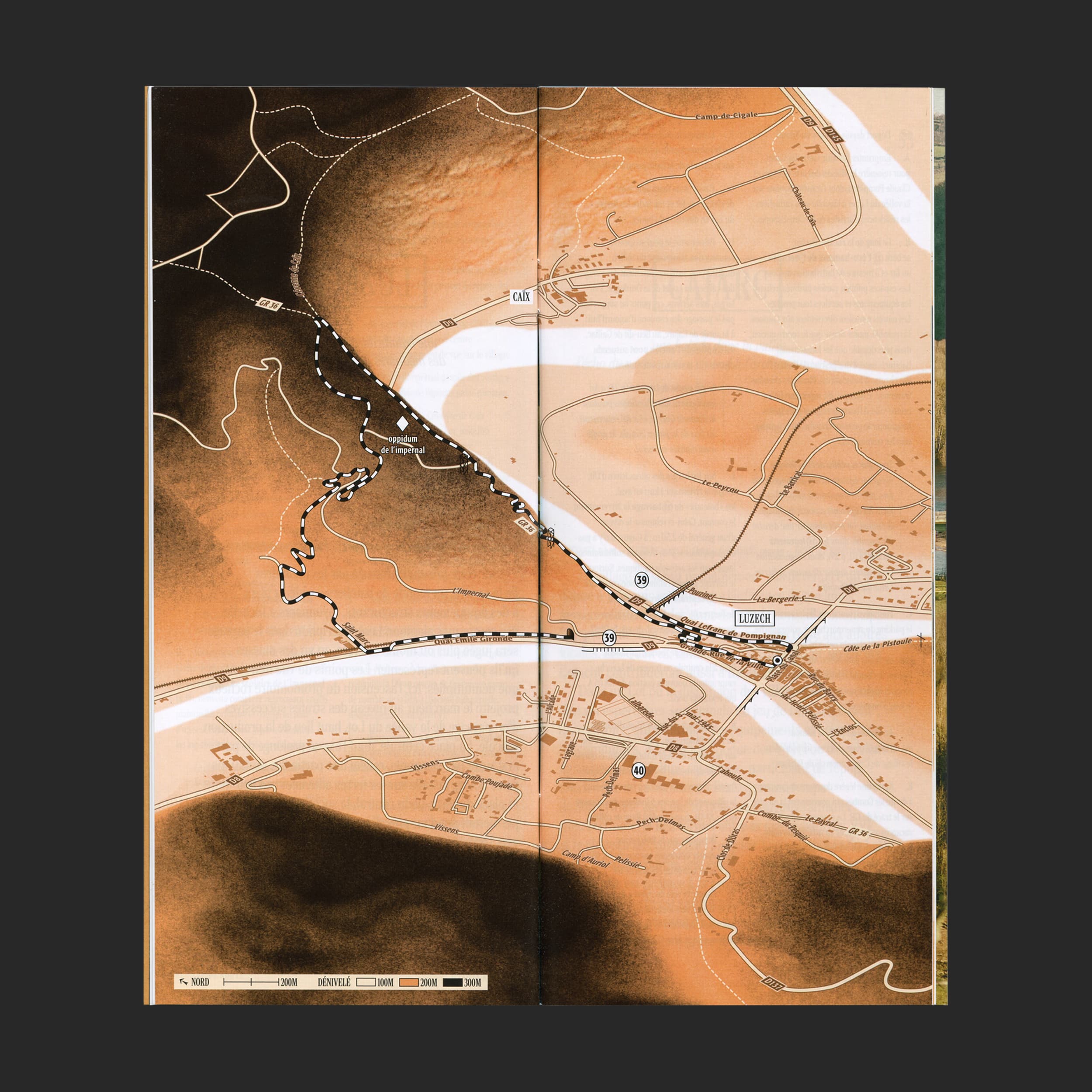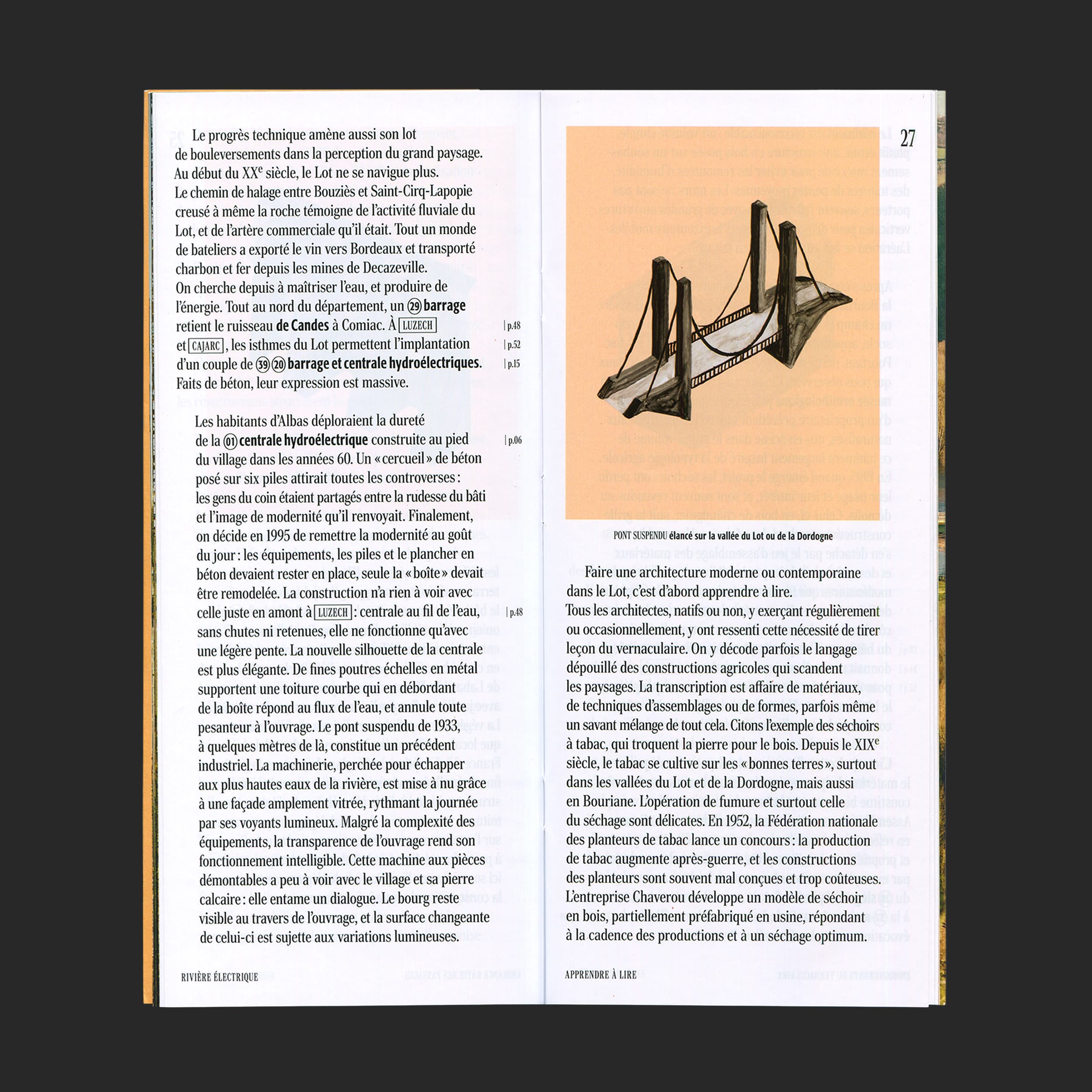 Le guide s’ouvre sur une balade photographique, promenade visuelle qui amène le lecteur vers une balade écrite, où les formes architecturales lotoises sont décryptées dans leur contexte. Enfin trois cartes en relief permettent de se repérer dans le paysage pour des balades à pied. Le guide accompagne le visiteur dans la lecture des formes vernaculaires, souvent présentes dans les constructions récentes, ainsi que le rapport qu’elles entretiennent à leur environnement.