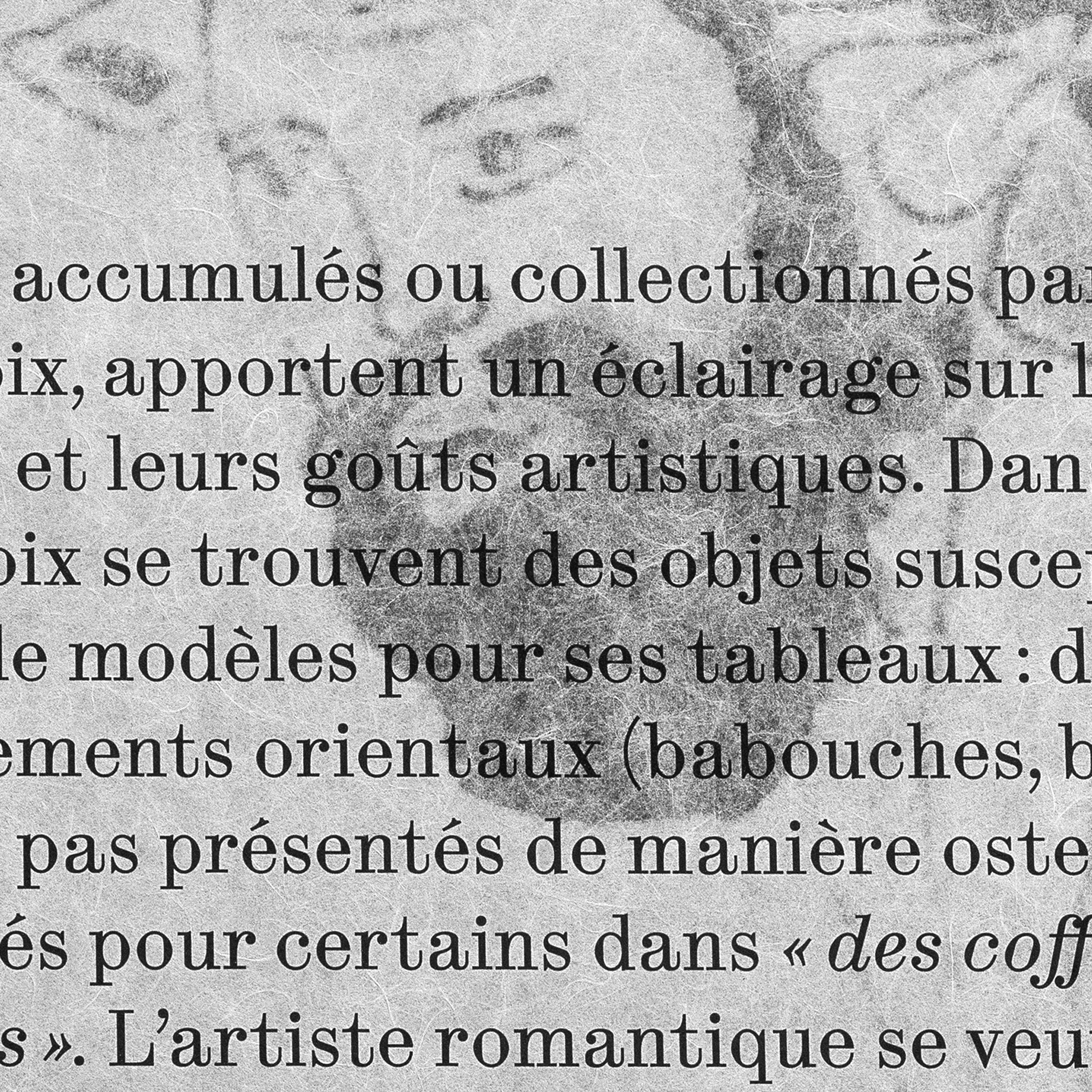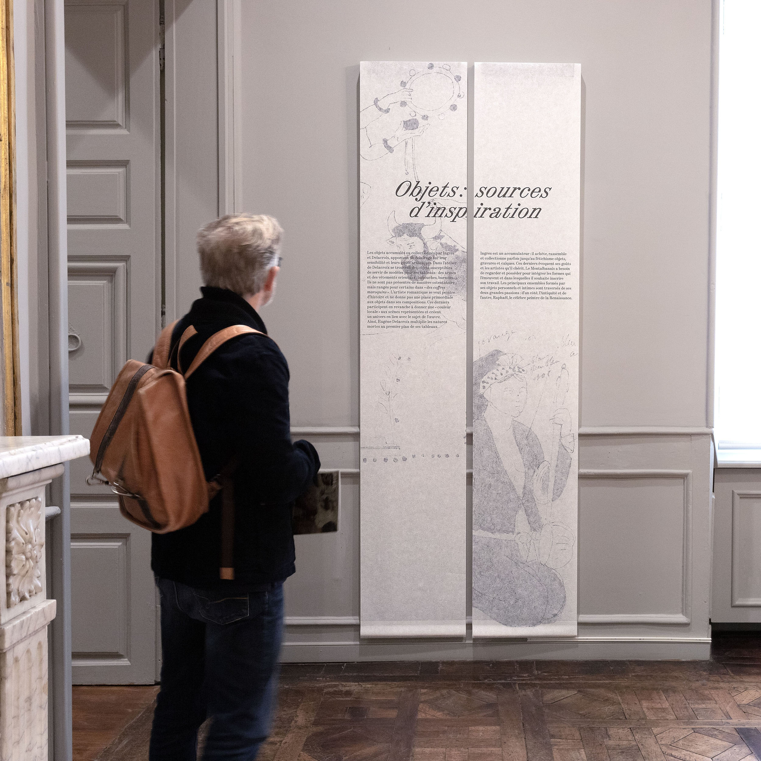 Ingres et Delacroix symbolisent peut-être malgré eux un moment emblématique de l’histoire de l’art de la première moitié du XIXe siècle: la bataille entre Néoclassicisme et Romantisme. L’exposition propose une exploration des univers des deux artistes, par le biais des objets intimes leur ayant appartenu. Les laizes de papier suspendues sont mises en mouvement par le passage des publics. Le visiteur retrouvera à chaque entrée de salle ce vocabulaire intimiste, à la fois textile et panneau d’exposition. Les joints des panneaux de texte sont assumés, en rappel aux éléments modulaires de la scénographie. Ils contribuent à une esthétique composite, entre deux dessins, à la croisée de deux visions de l’art.