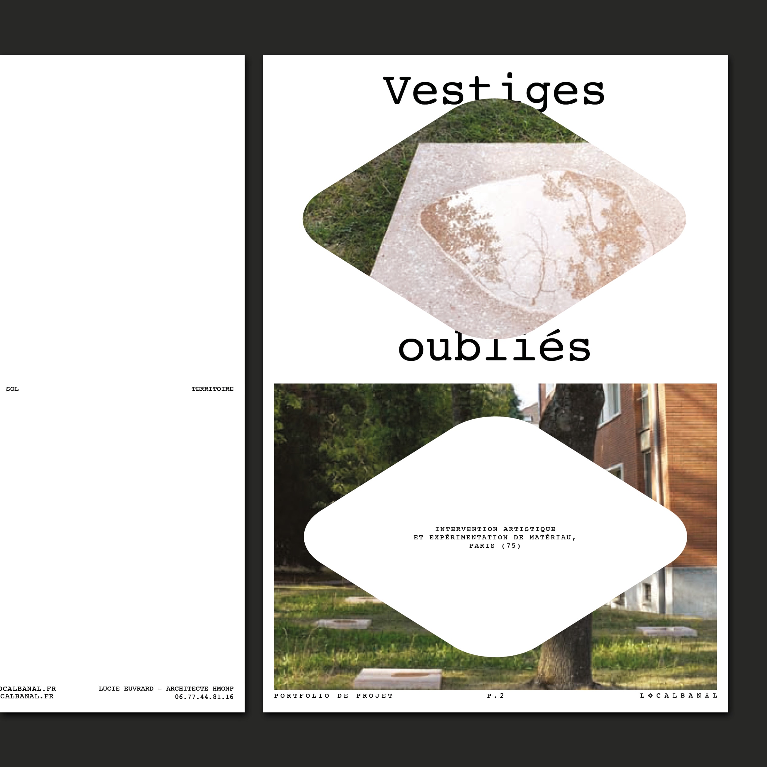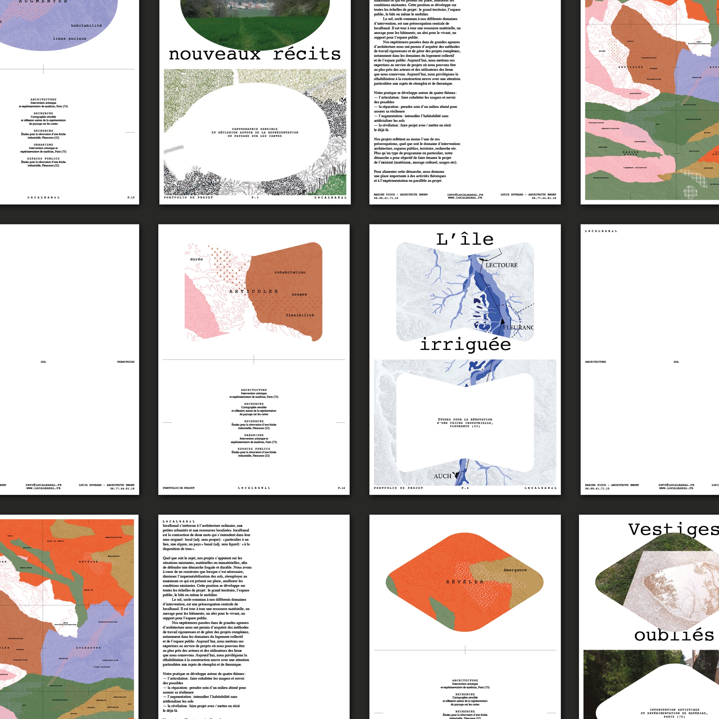 Identité visuelle légère pour Localbanal un atelier intervenant à trois échelles: architecture, sol et territoire. Lucie Euvrard et Marine Picco souhaitaient mettre en image leurs champs de réflexion qui s’organisent autour de quatre territoires abstraits: réparer, révéler, articuler et augmenter. Une cartographie polysémique, pouvant se fractionner, a été dessinée afin de rythmer leurs supports éditoriaux (couvertures, gardes de chapitres, c.v., etc.).