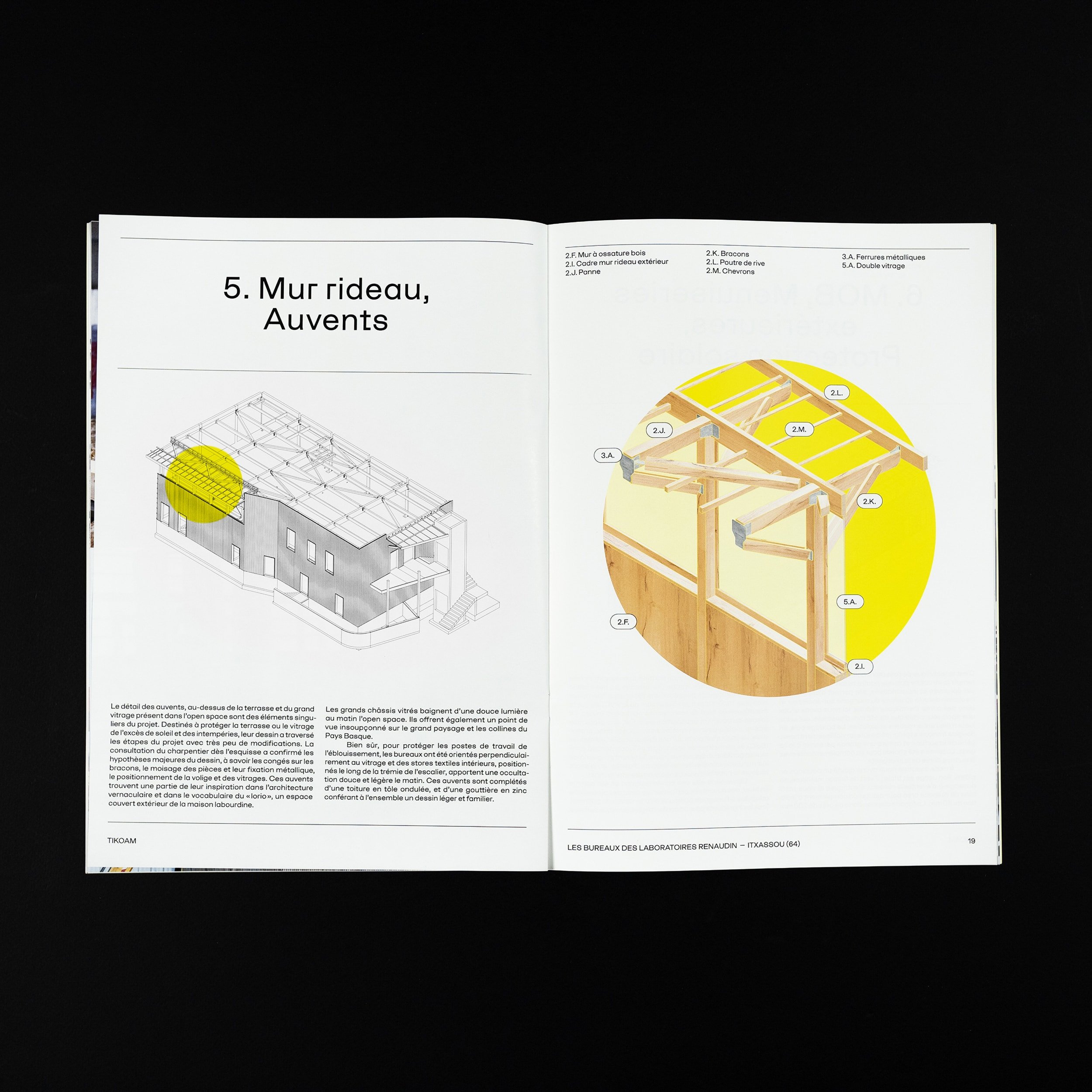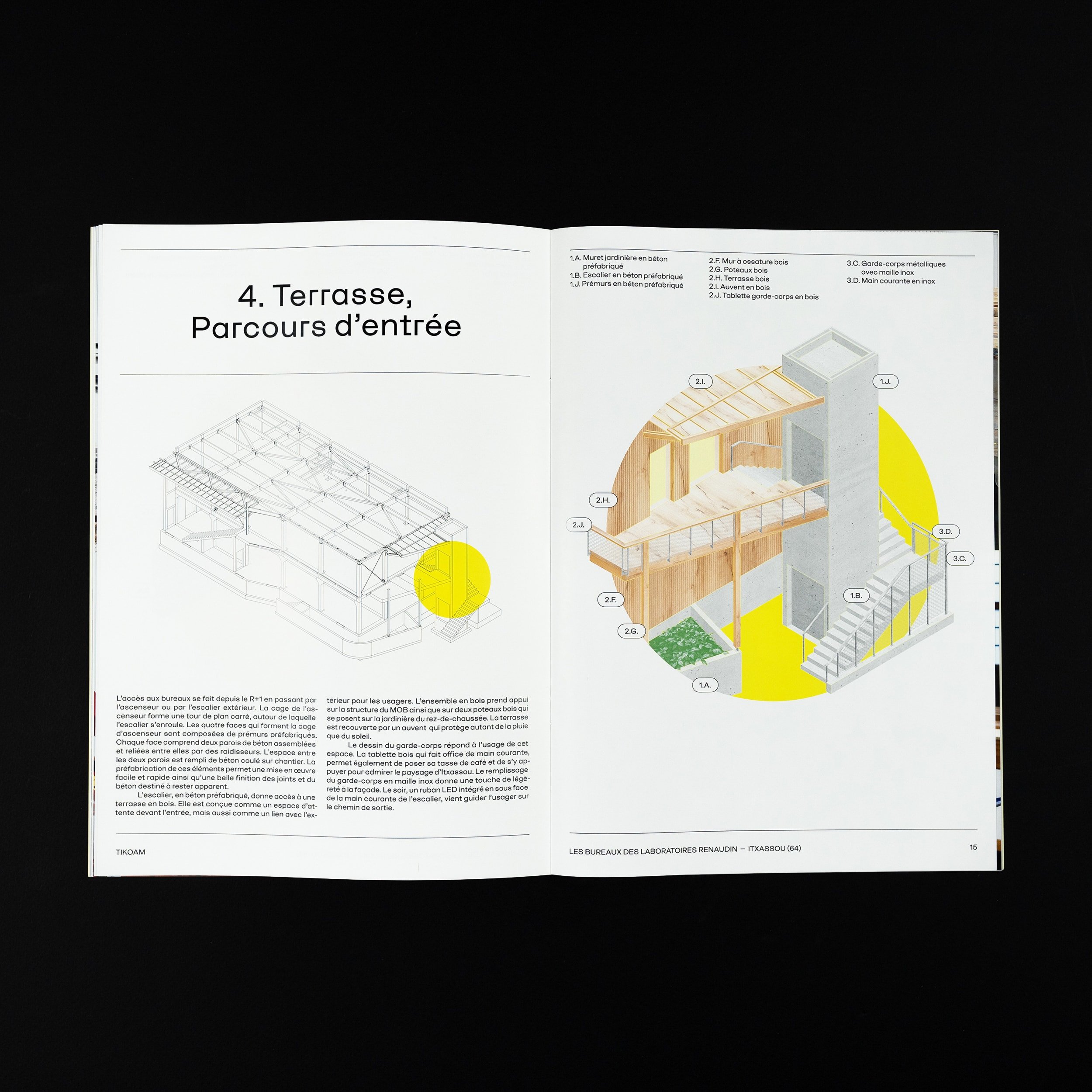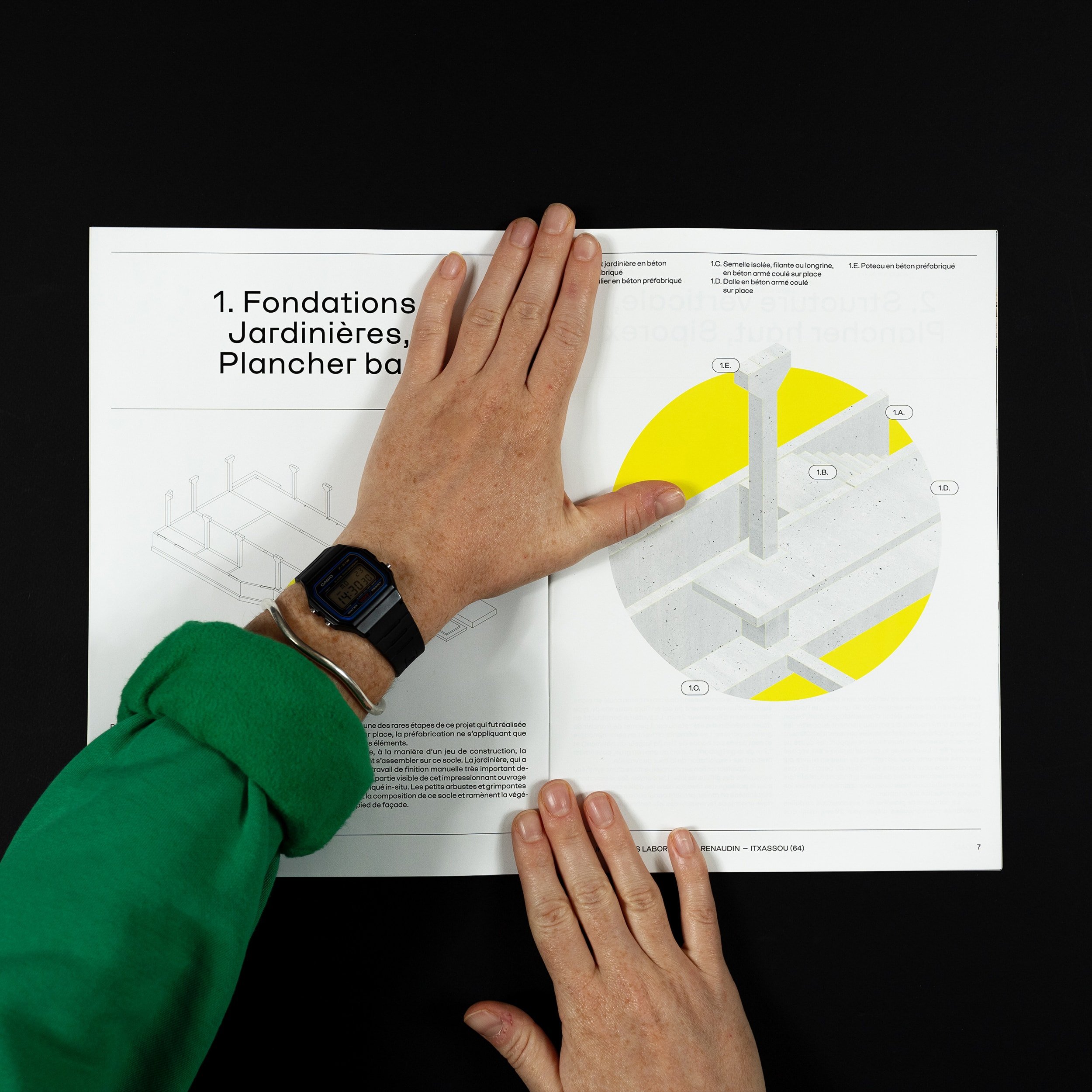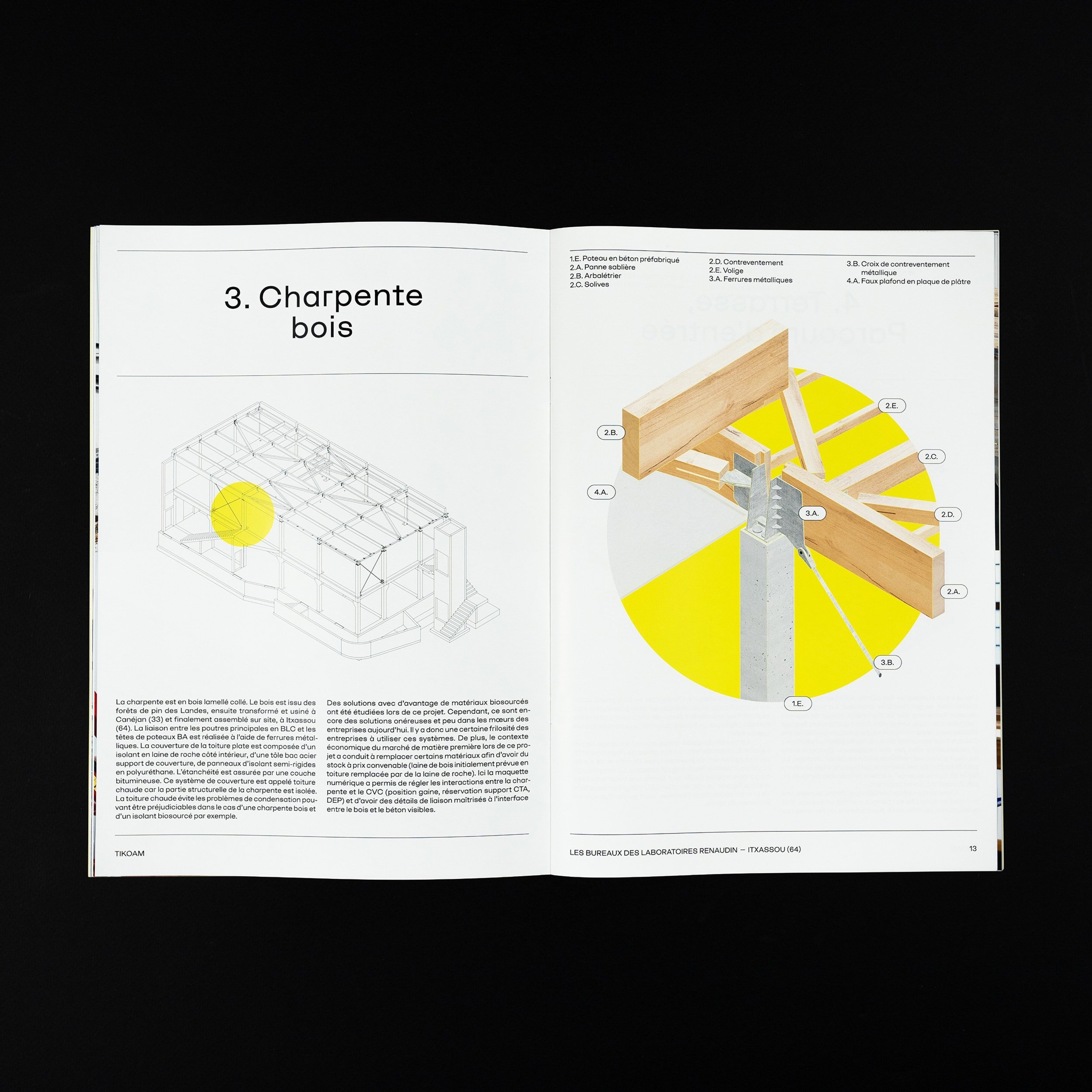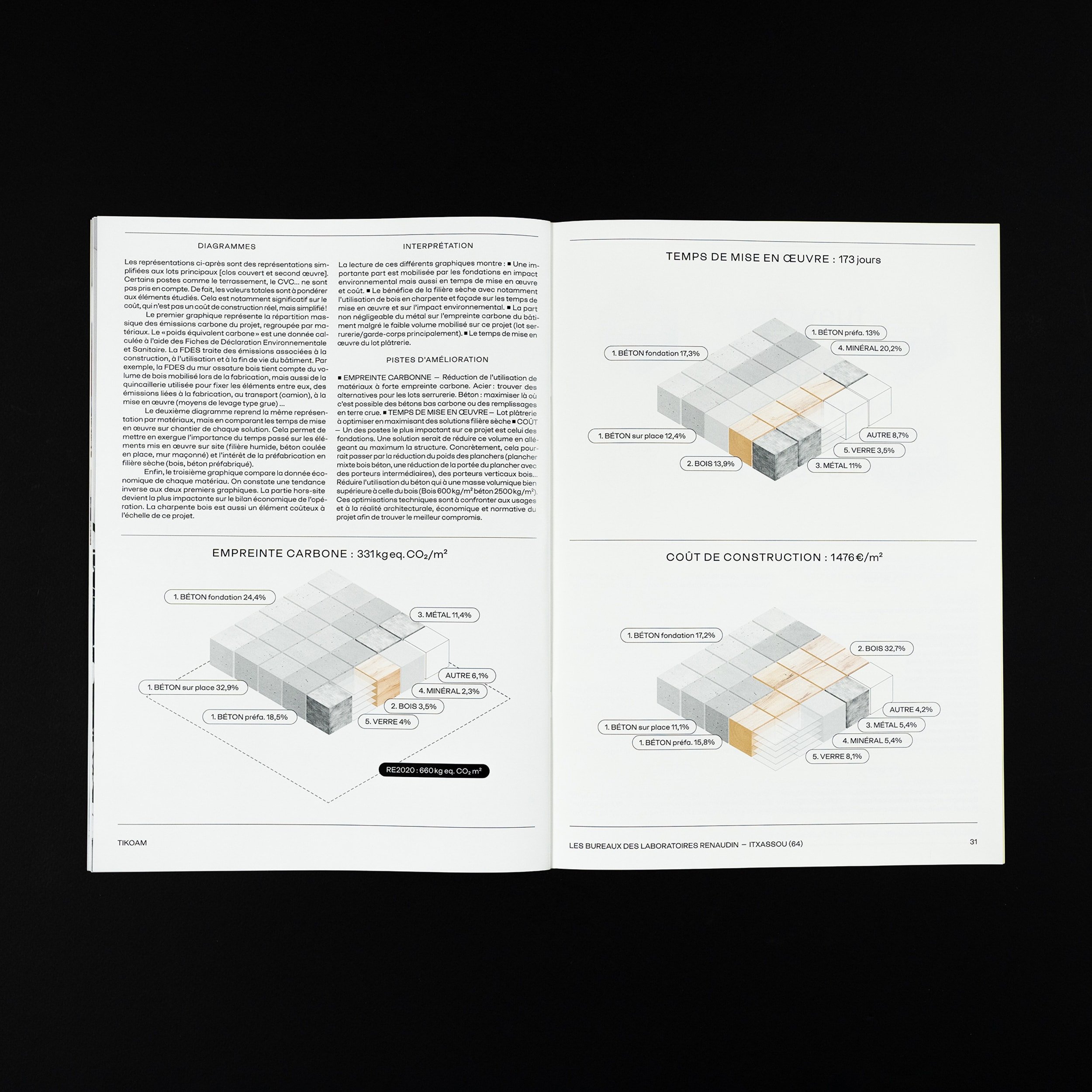 L’agence d’architecture Tikoam nous sollicite pour rendre compte du processus de pré-fabrication des laboratoires Renaudin. Le dossier de presse prend la forme d’une notice de montage, qui décompose les étapes essentielles de la construction. Les axonométries réalisées pour l’occasion illustrent les proportions des différents matériaux utilisés (béton, bois, métal, minéral, verre). Chaque fois référencés, ces matériaux permettent de poser trois regards objectifs sur le bâtiment : empreinte carbone — temps de mise en œuvre — coût de construction.