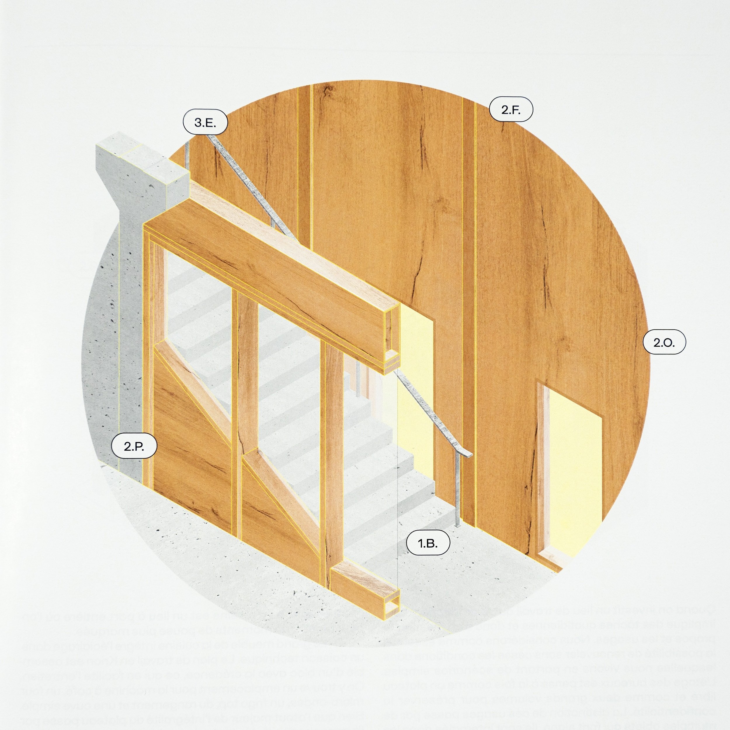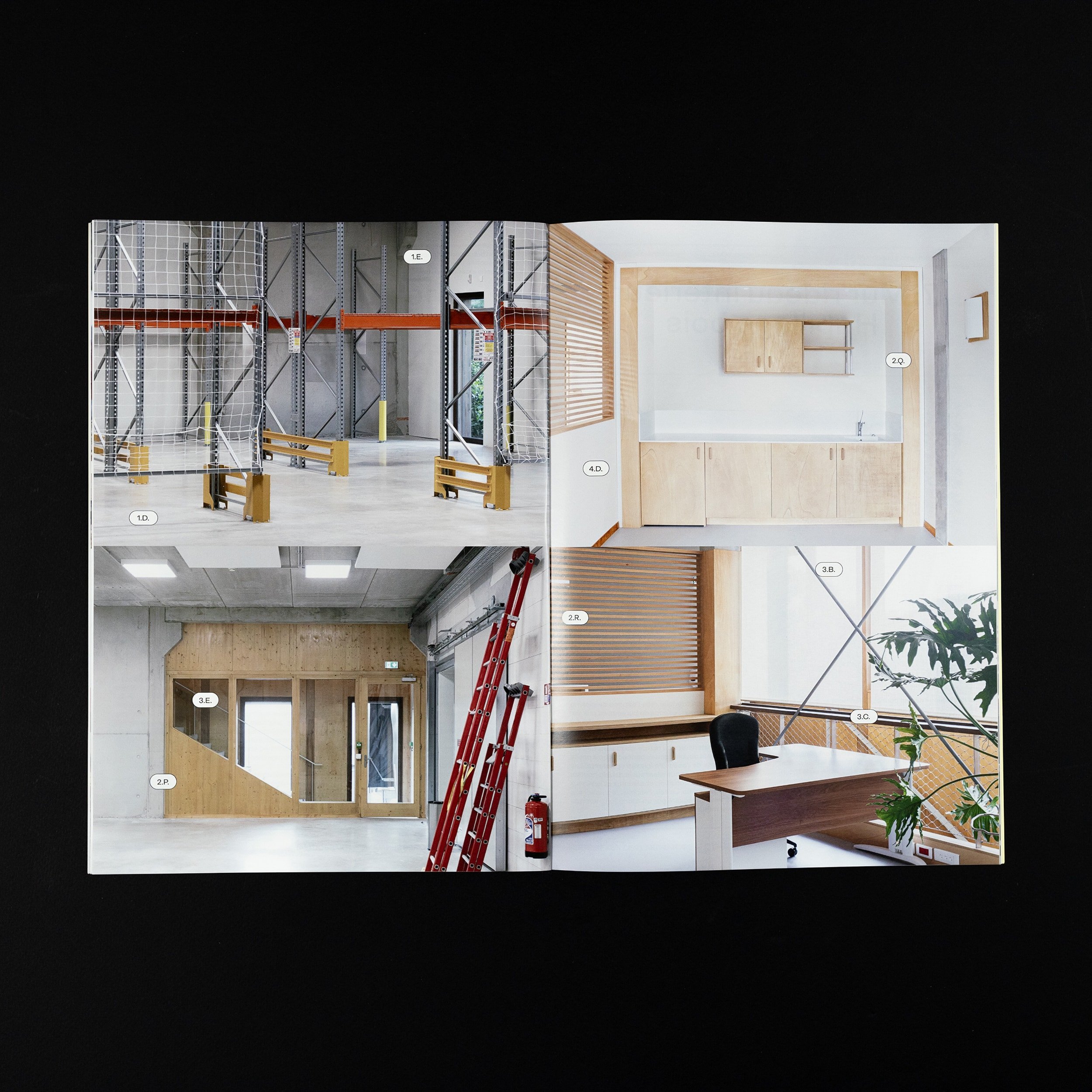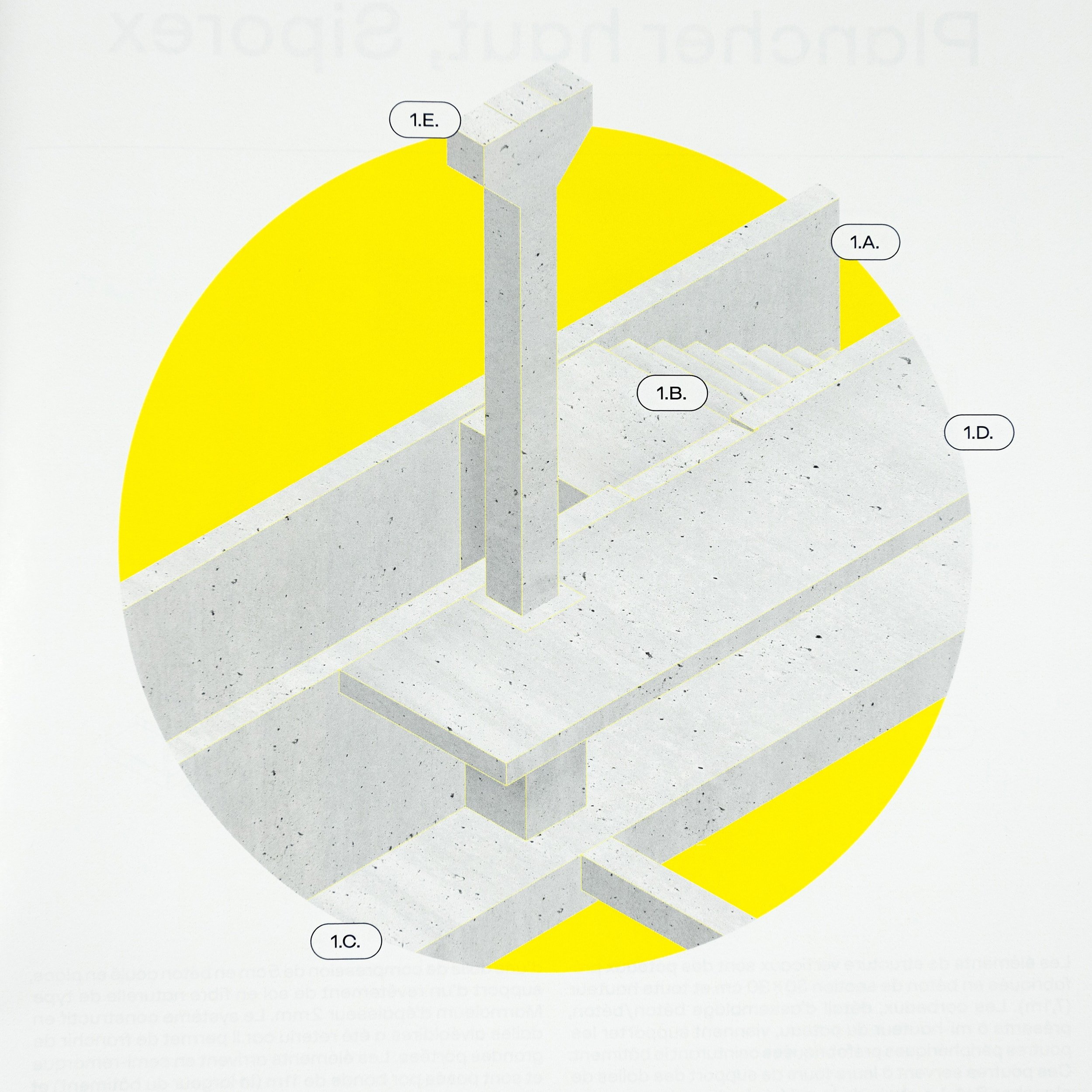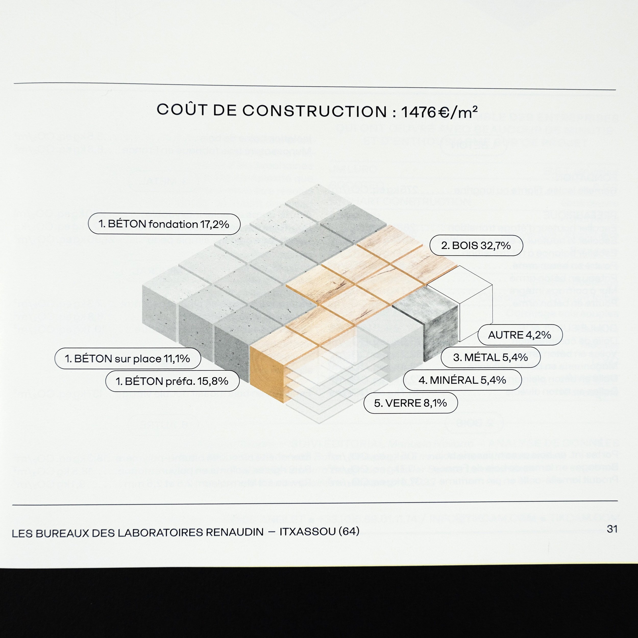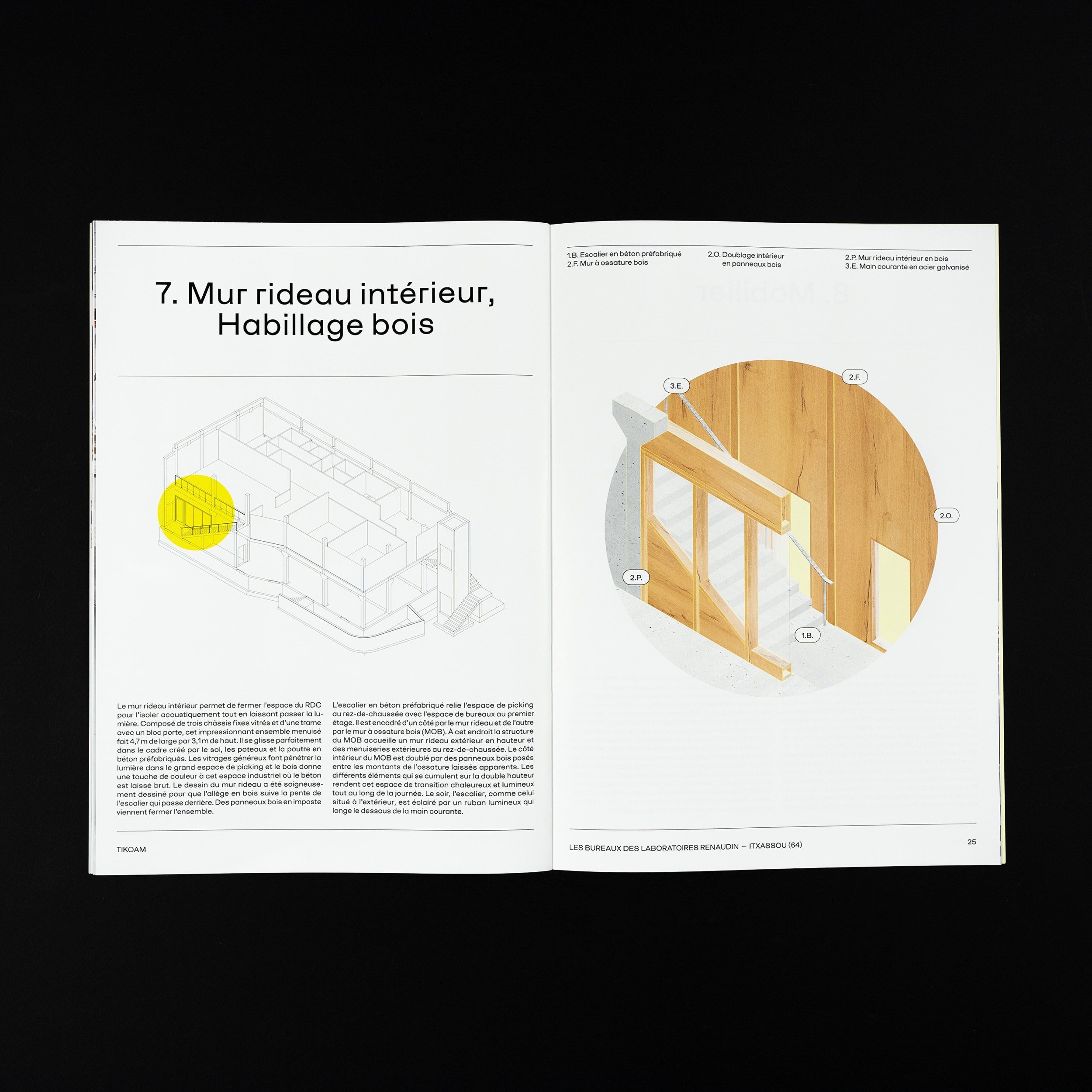 L’agence d’architecture Tikoam nous sollicite pour rendre compte du processus de pré-fabrication des laboratoires Renaudin. Le dossier de presse prend la forme d’une notice de montage, qui décompose les étapes essentielles de la construction. Les axonométries réalisées pour l’occasion illustrent les proportions des différents matériaux utilisés (béton, bois, métal, minéral, verre). Chaque fois référencés, ces matériaux permettent de poser trois regards objectifs sur le bâtiment : empreinte carbone — temps de mise en œuvre — coût de construction.