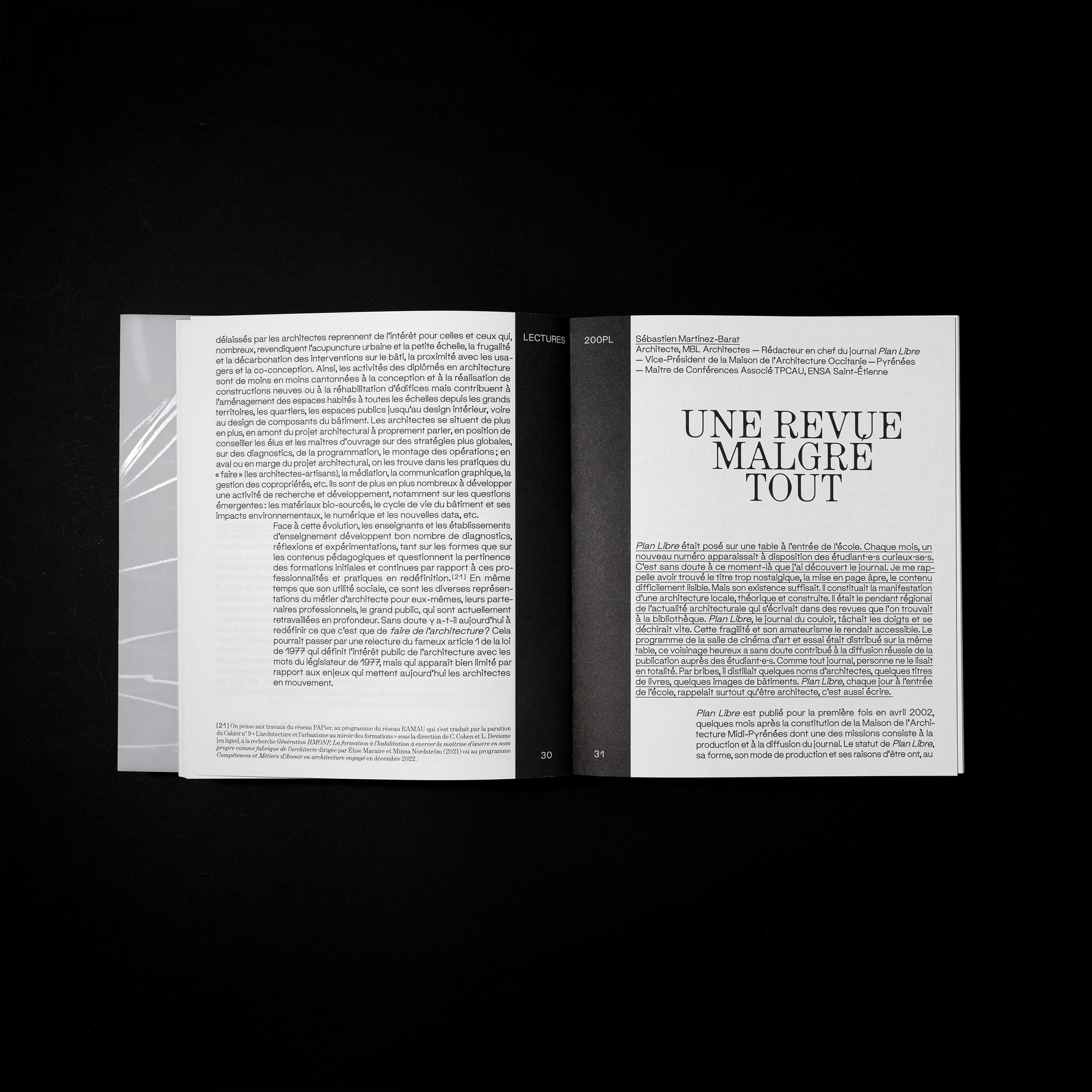 Motif blister et macules fantômes pour fêter l’anniversaire du journal Plan Libre ! « 200 Plan libre. Anatomie d’un journal d’architecture » retrace l’histoire de 20 ans de parutions, au fil de ses contributeurs et de ses versions graphiques. Le livre s’articule autour de quatre parties, lisibles sur la tranche : LECTURES apporte un regard actuel sur les évolutions de la discipline 🔎 FAC-SIMILÉS reproduit une sélection d’articles phares 🔦 RECUEIL D’IMAGES s’amuse à produire des rencontres iconographiques 💥 ANALYSE DE DONNÉES propose un regard analytique par des données soigneusement collectées 📈