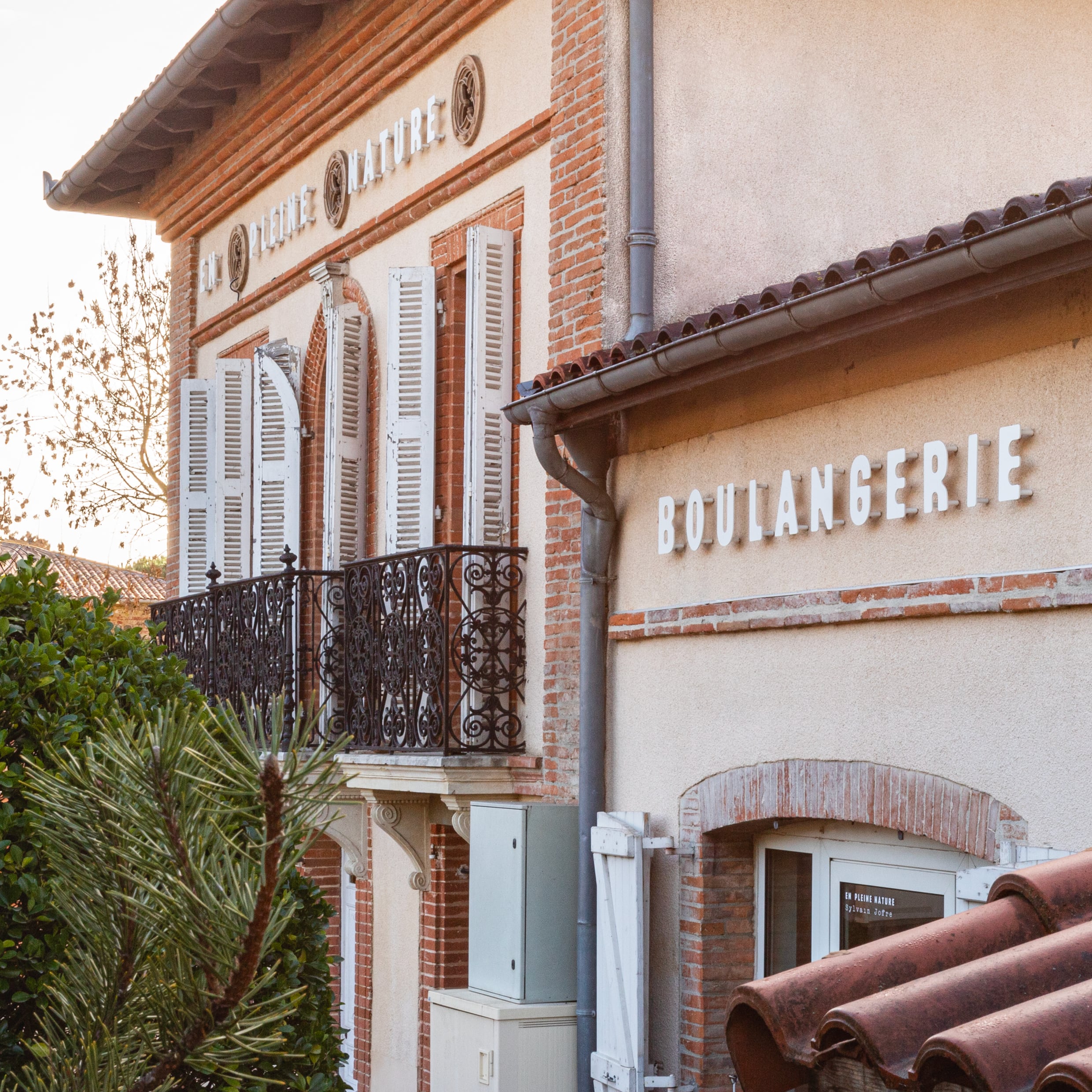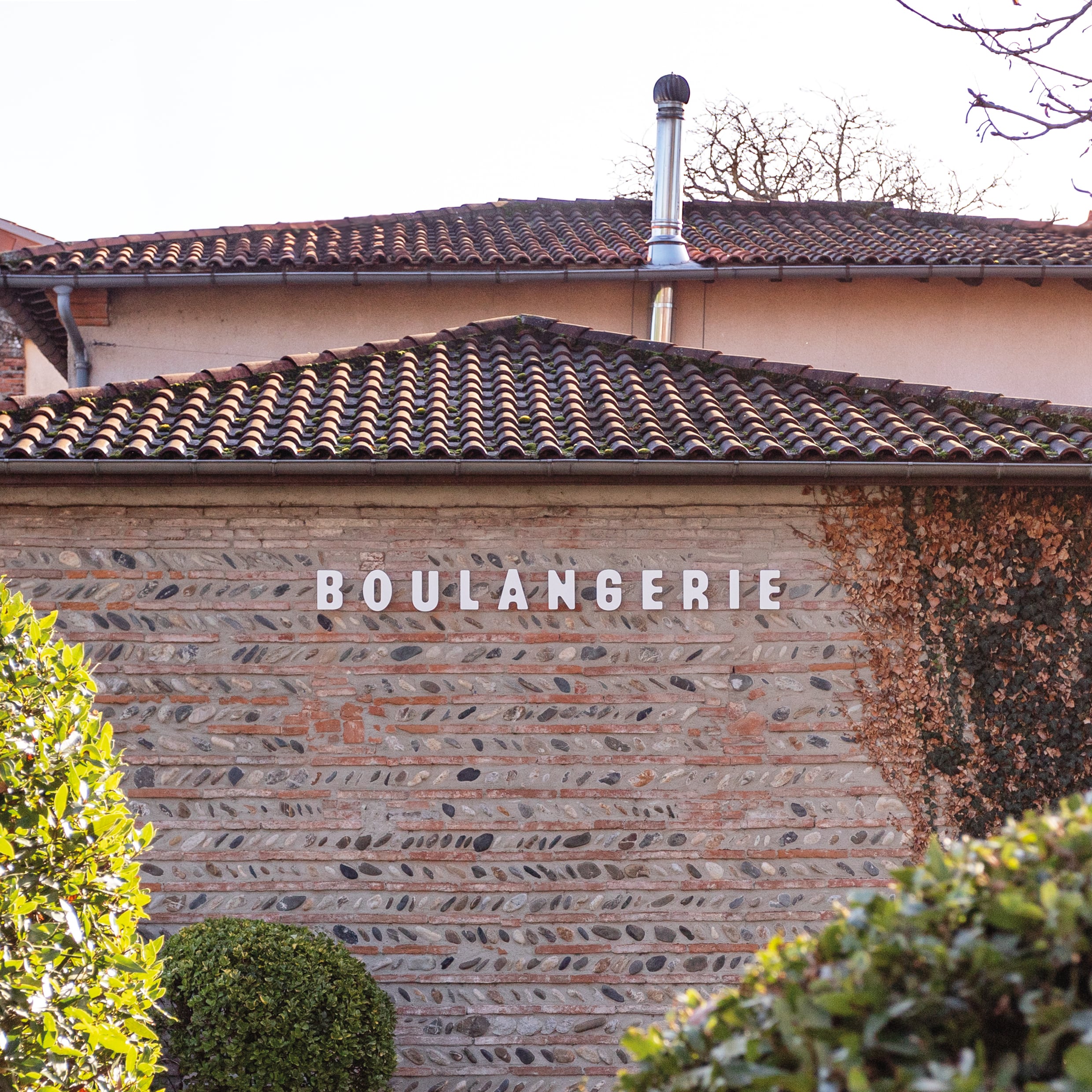 Pas de bon repas sans bon pain: la boulangerie jouxte le restaurant En pleine nature et fabrique quotidiennement les pains servis à table. Implantée sur une bâtisse frontonnaise, l’enseigne s’inscrit dans la logique des briques et des galets, aux formes à la fois souples et rythmées.