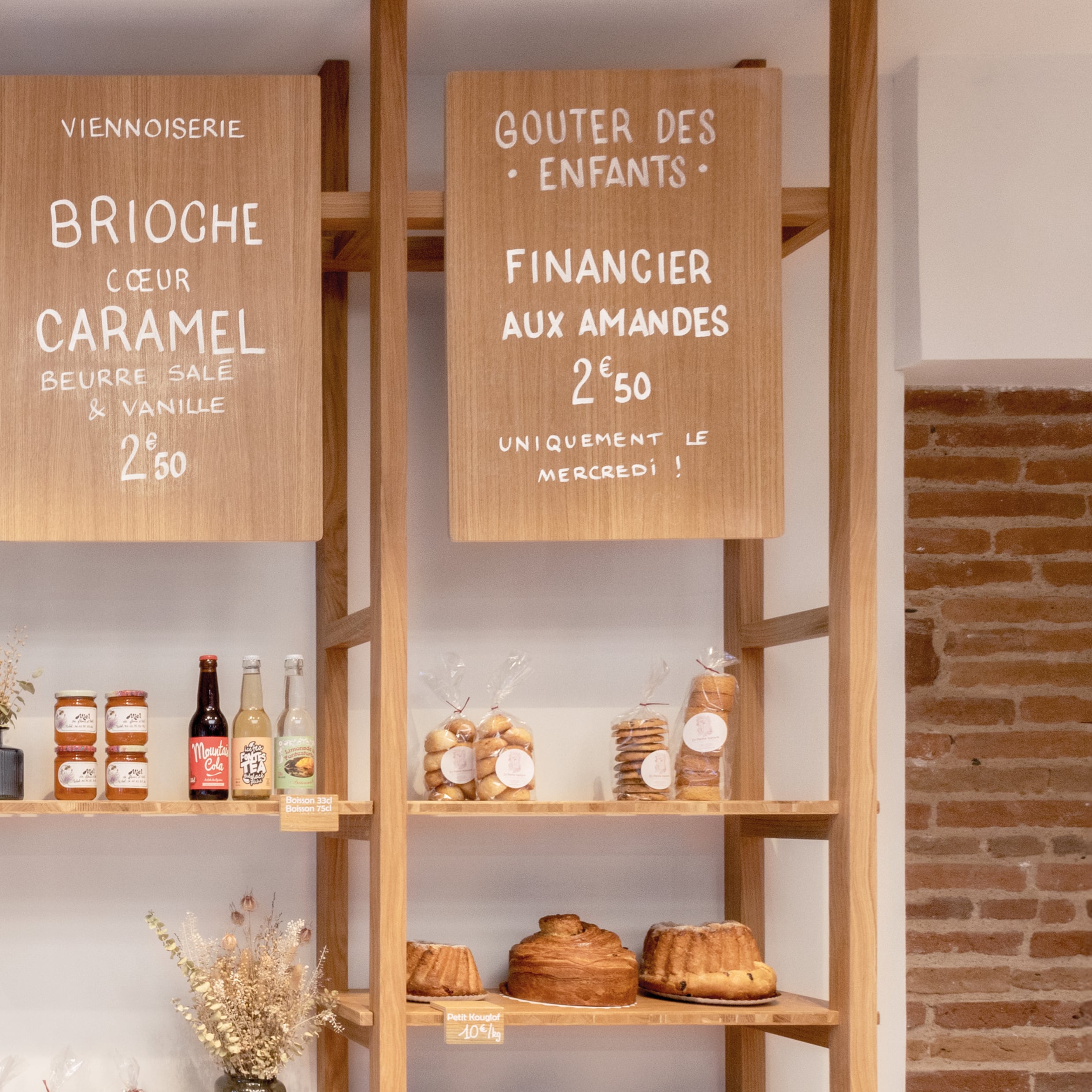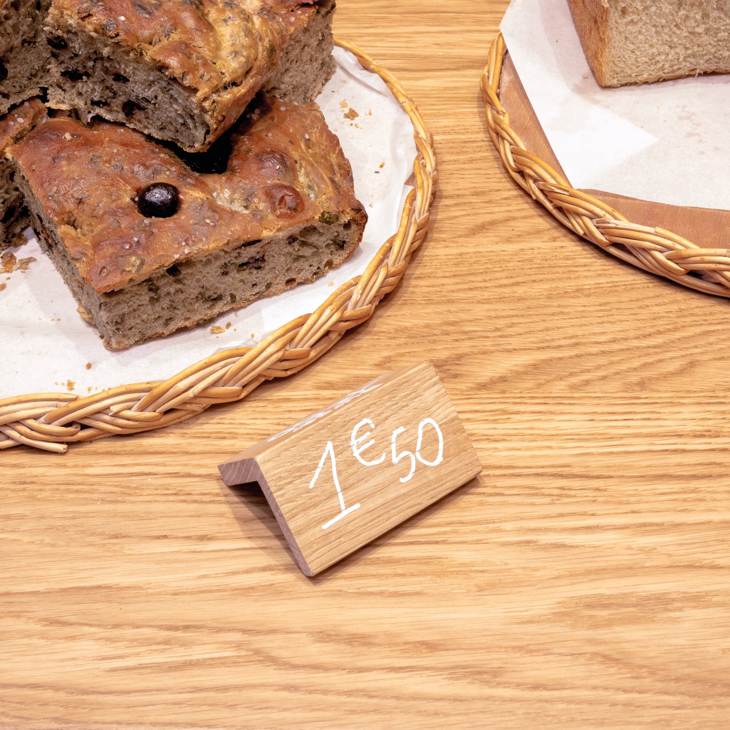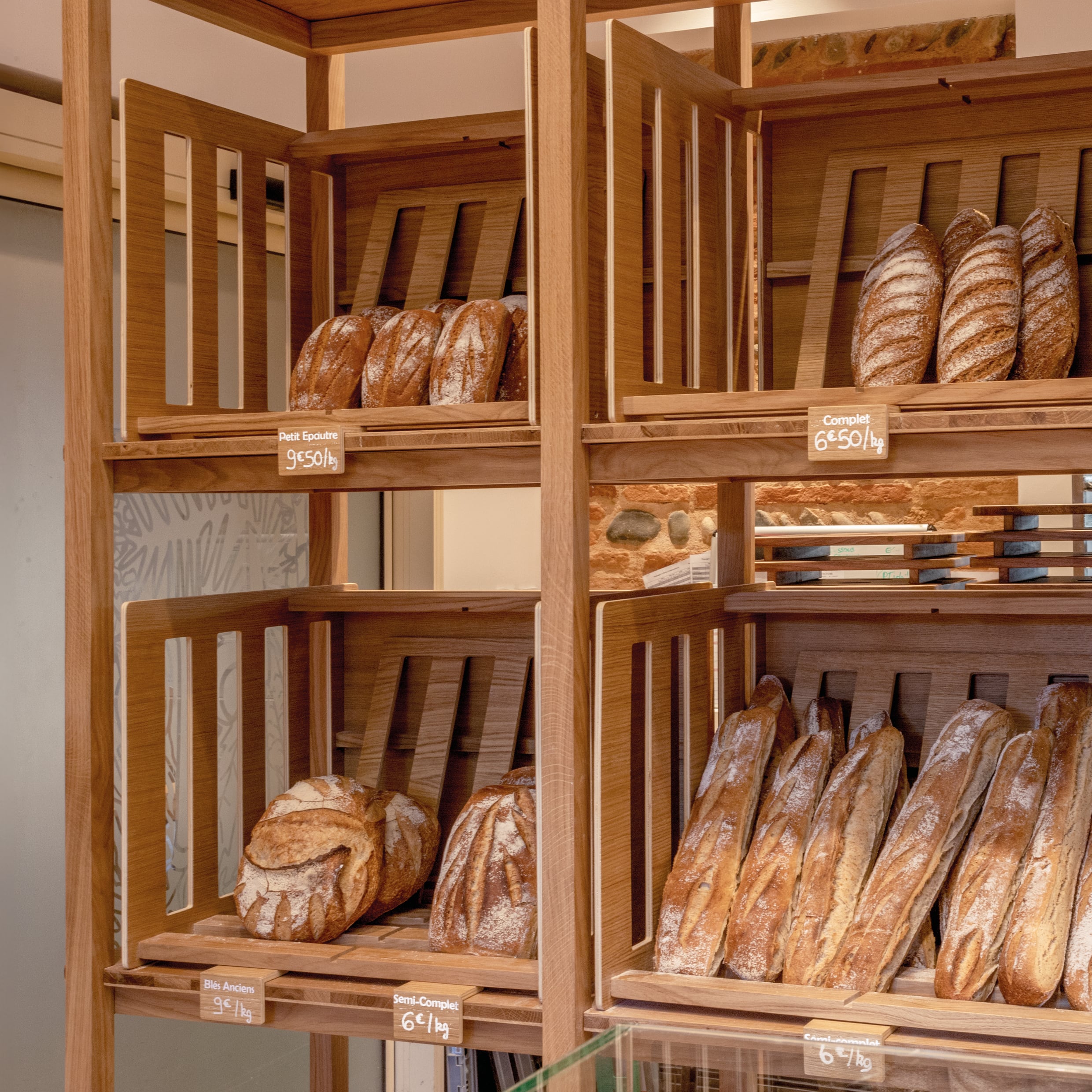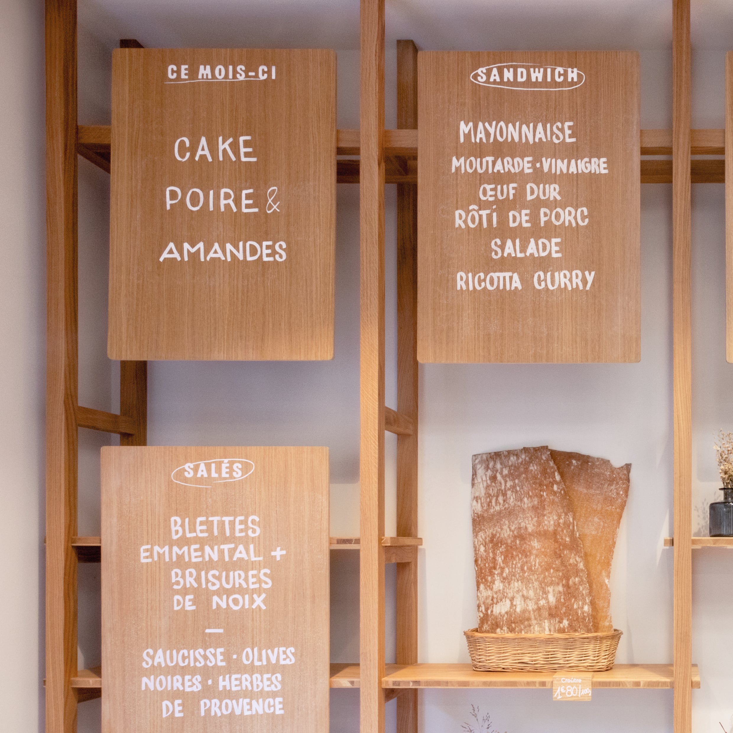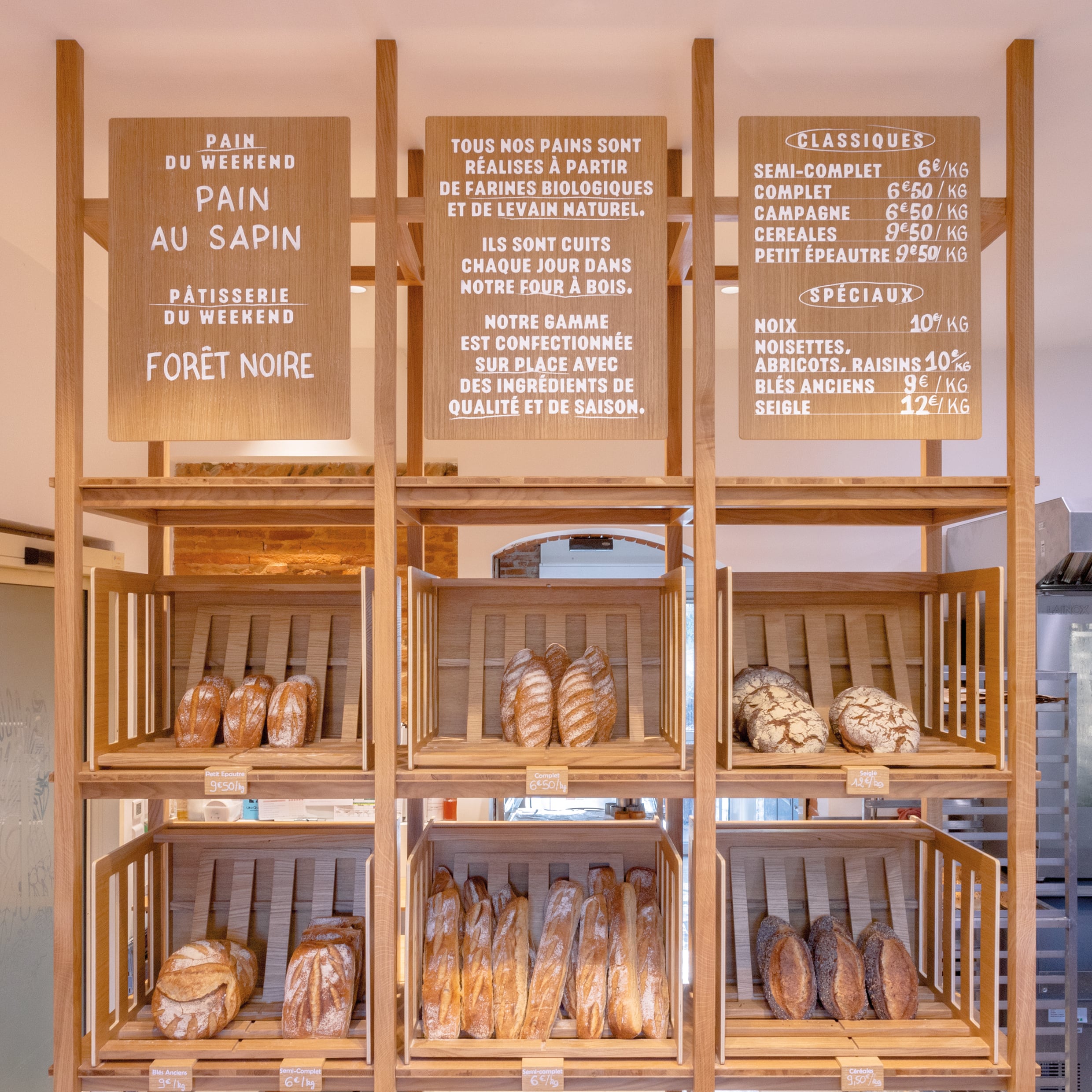 L’aménagement de la boulangerie conçu par Hanika Perez et Brice Genre (A+B) se déploie en verticalité pour optimiser l’espace de vente. Les grandes échelles murales permettent des mises en scène variées, tandis qu’un grand comptoir aux motifs de clayettes prolonge un vocabulaire issu du monde rural. Le chêne devient aussi le support de la signalétique intérieure: les nouveautés sont inscrites au feutre à craie sur les panneaux de bois, suspendus dans la hauteur de cet espace contraint. Les pains sont ainsi distribués à hauteur de regard, et à portée des gourmands.