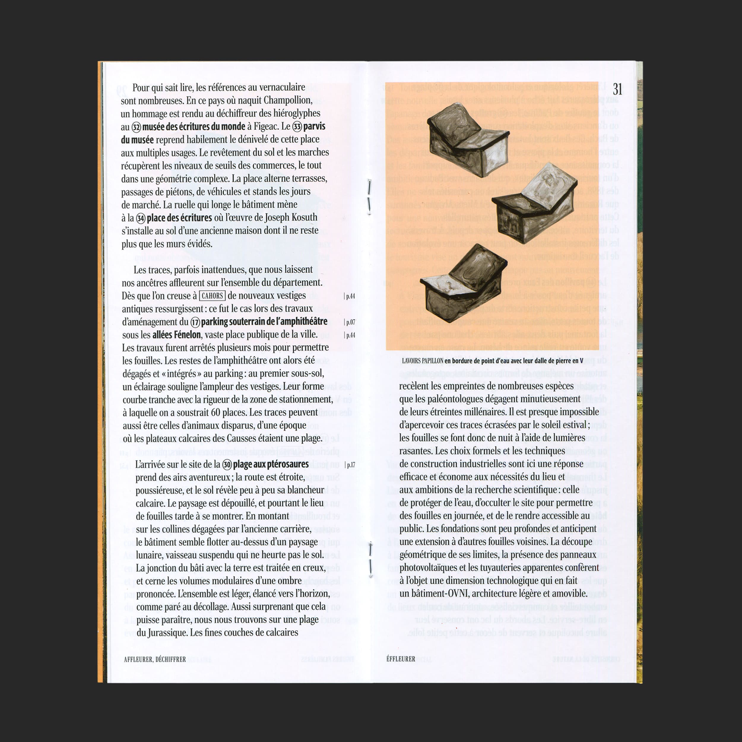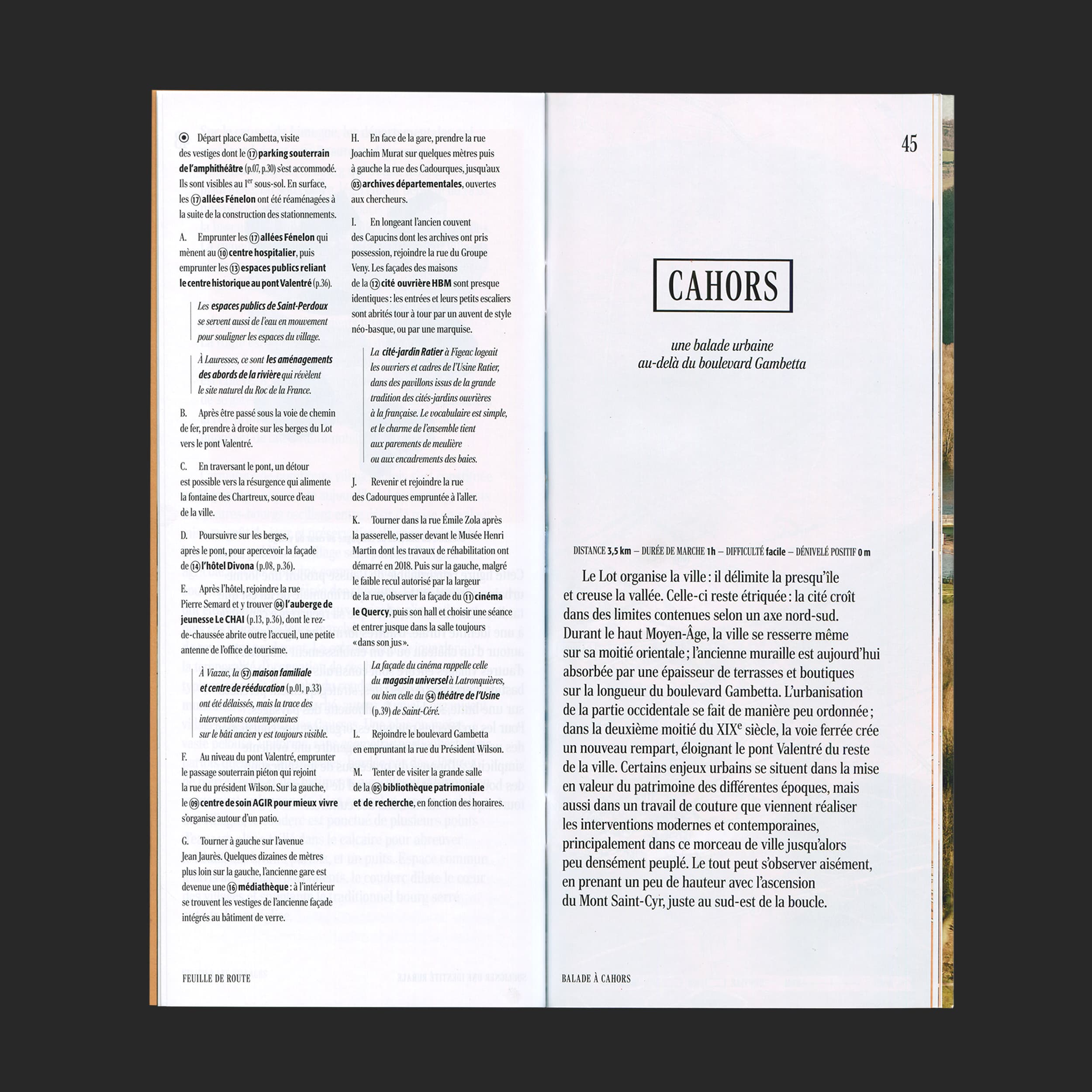 Le guide s’ouvre sur une balade photographique, promenade visuelle qui amène le lecteur vers une balade écrite, où les formes architecturales lotoises sont décryptées dans leur contexte. Enfin trois cartes en relief permettent de se repérer dans le paysage pour des balades à pied. Le guide accompagne le visiteur dans la lecture des formes vernaculaires, souvent présentes dans les constructions récentes, ainsi que le rapport qu’elles entretiennent à leur environnement.