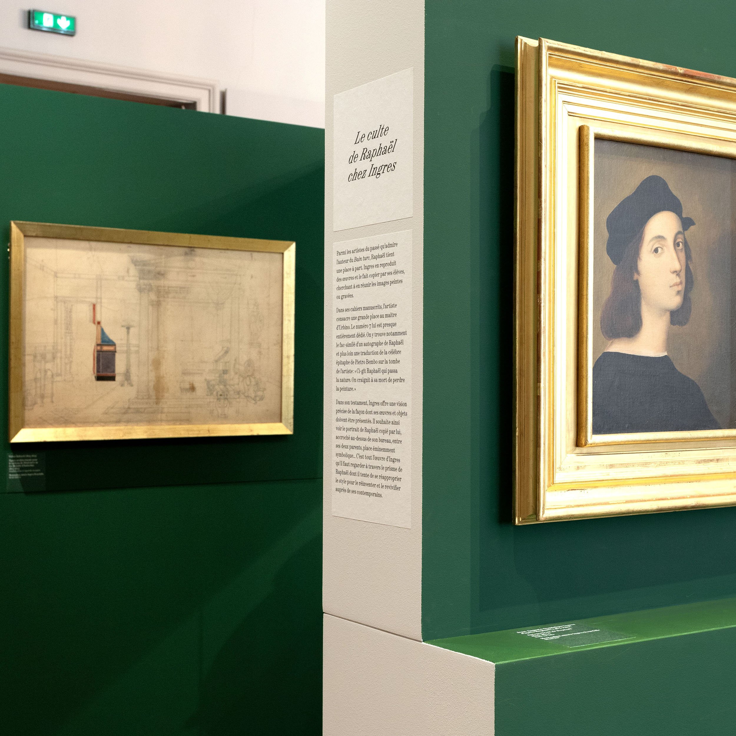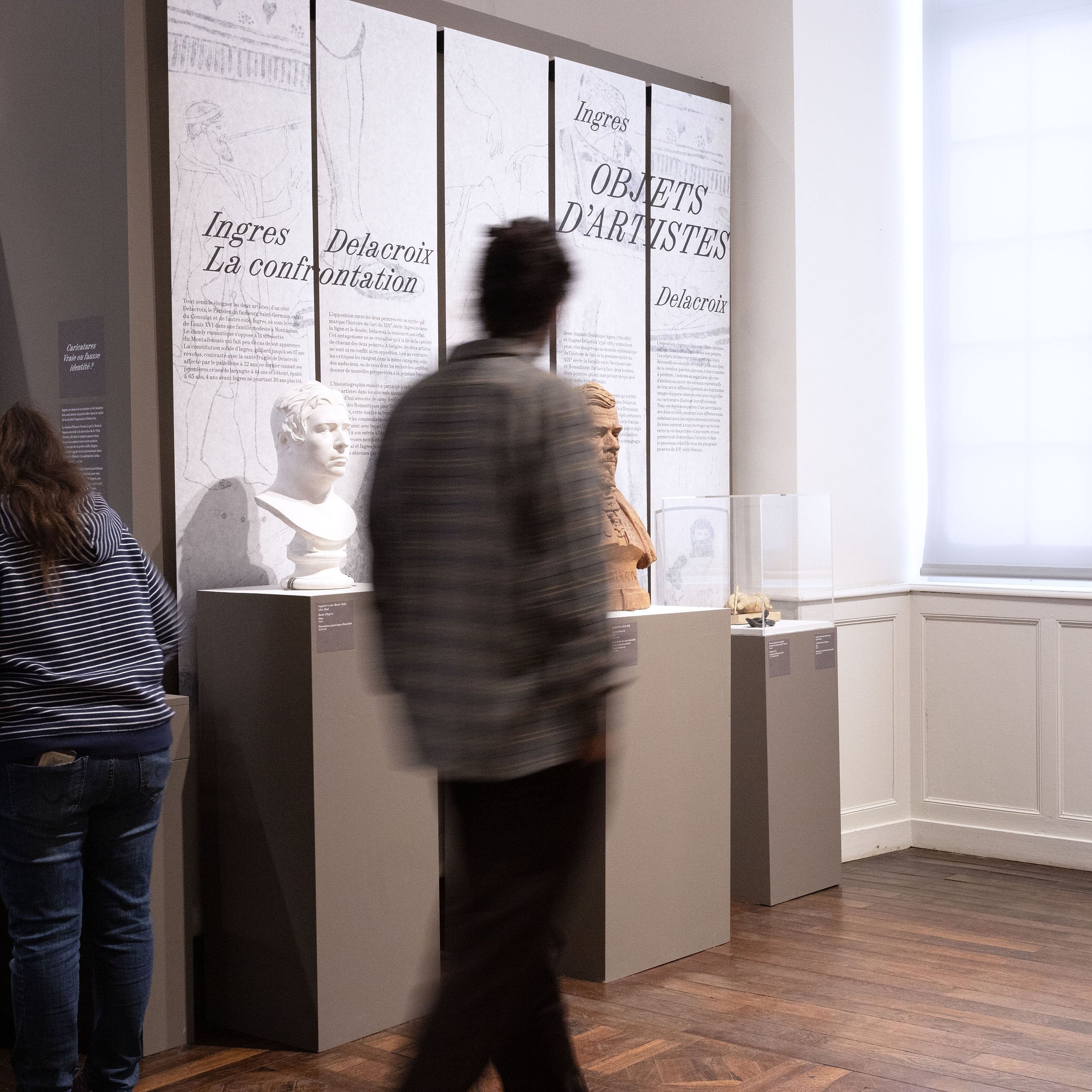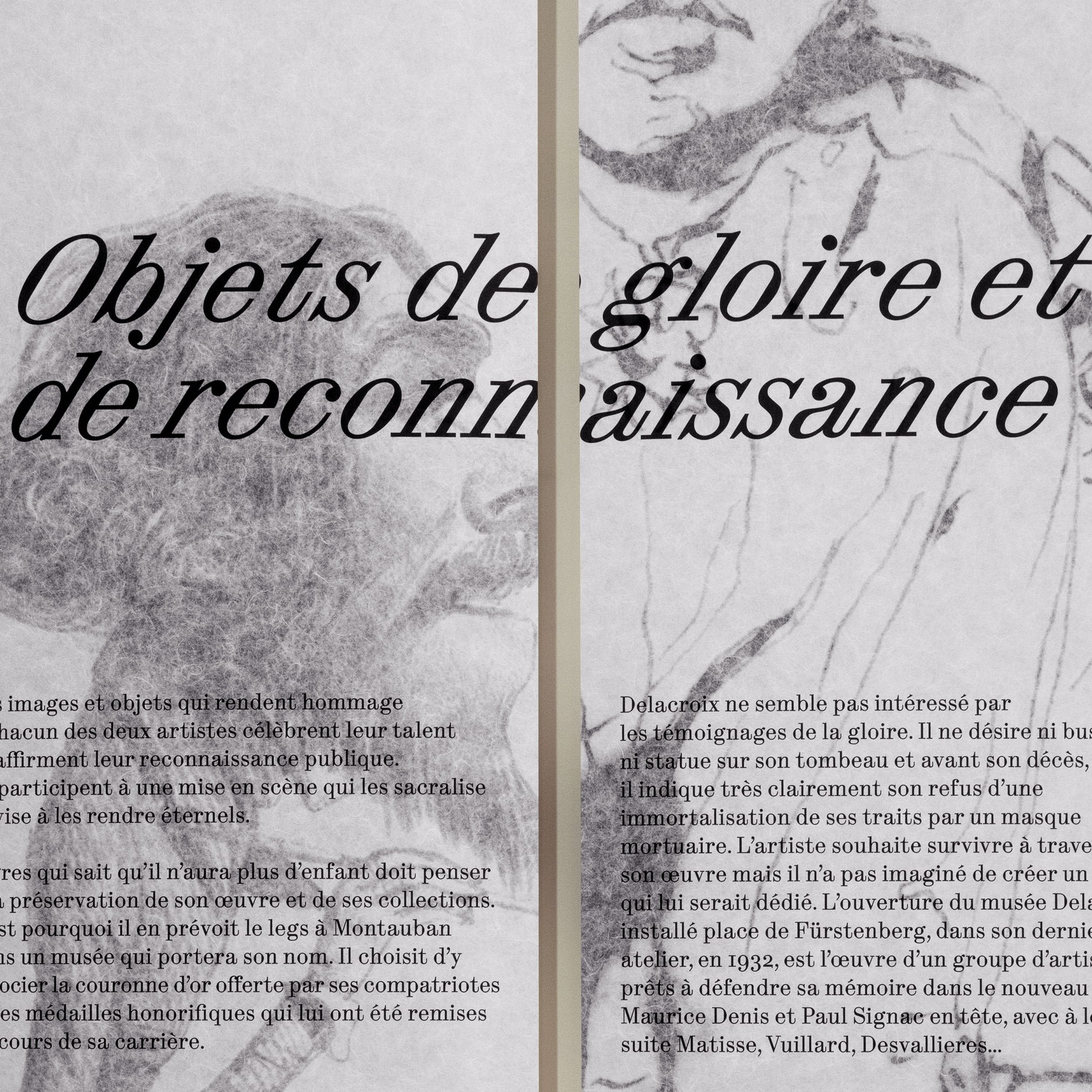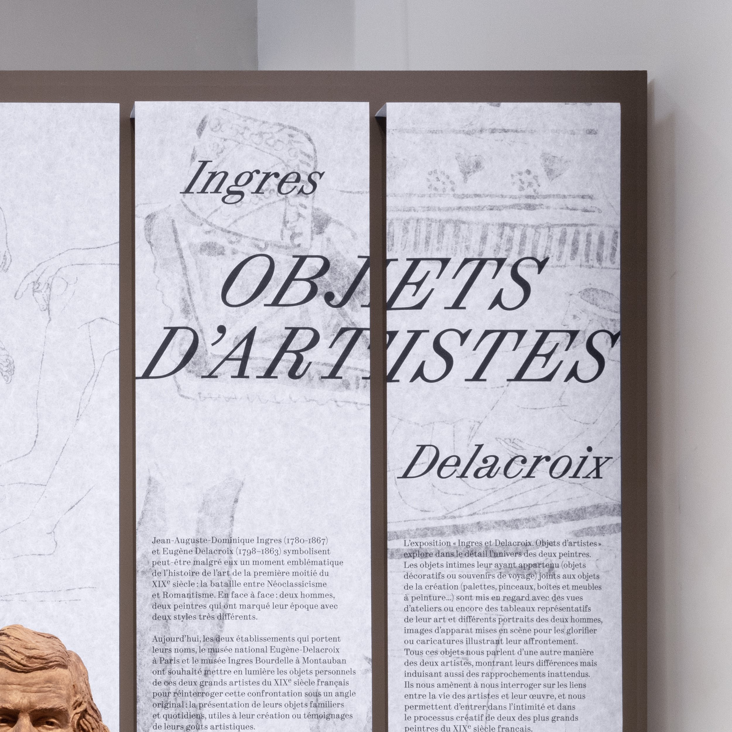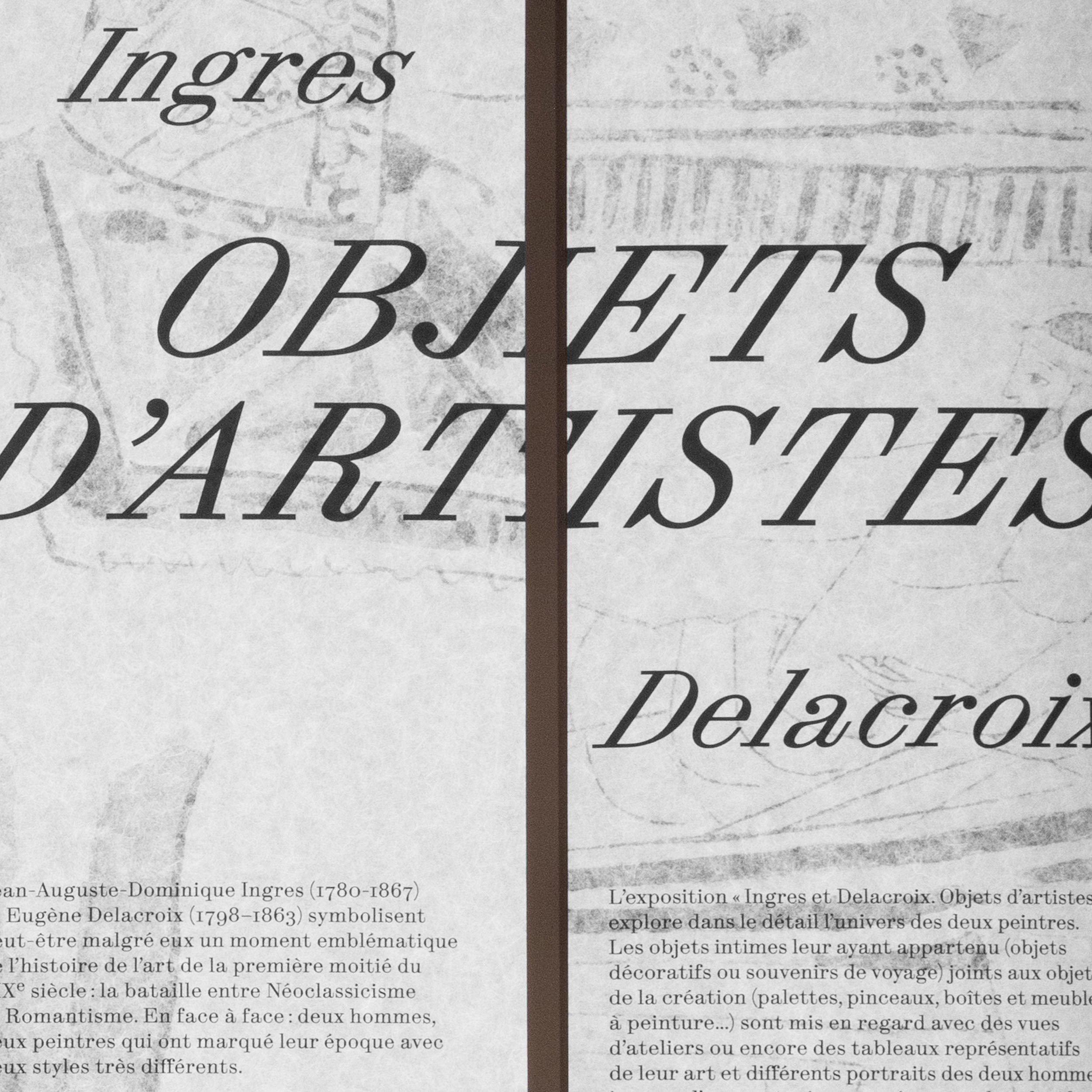 Ingres et Delacroix symbolisent peut-être malgré eux un moment emblématique de l’histoire de l’art de la première moitié du XIXe siècle: la bataille entre Néoclassicisme et Romantisme. L’exposition propose une exploration des univers des deux artistes, par le biais des objets intimes leur ayant appartenu. Les laizes de papier suspendues sont mises en mouvement par le passage des publics. Le visiteur retrouvera à chaque entrée de salle ce vocabulaire intimiste, à la fois textile et panneau d’exposition. Les joints des panneaux de texte sont assumés, en rappel aux éléments modulaires de la scénographie. Ils contribuent à une esthétique composite, entre deux dessins, à la croisée de deux visions de l’art.
