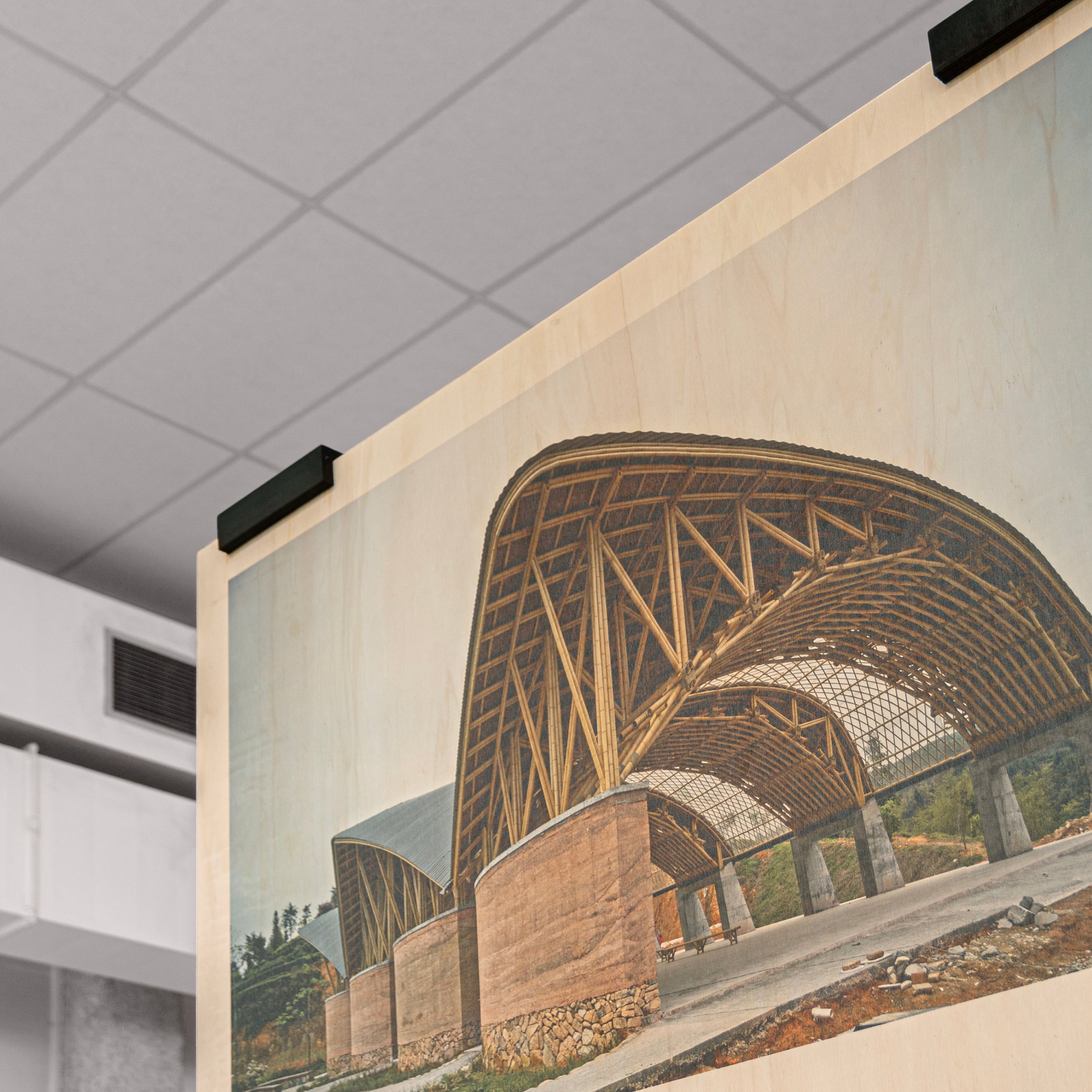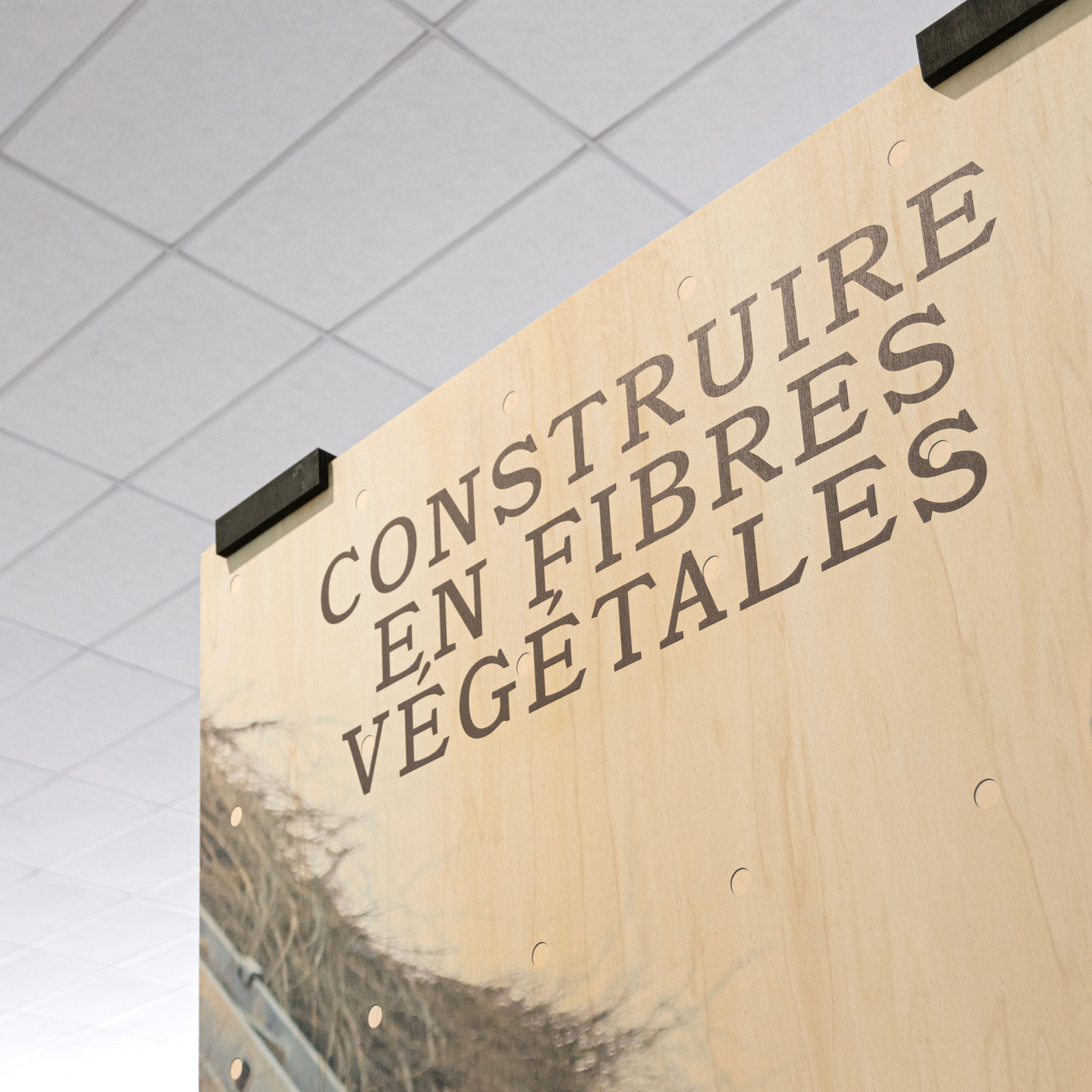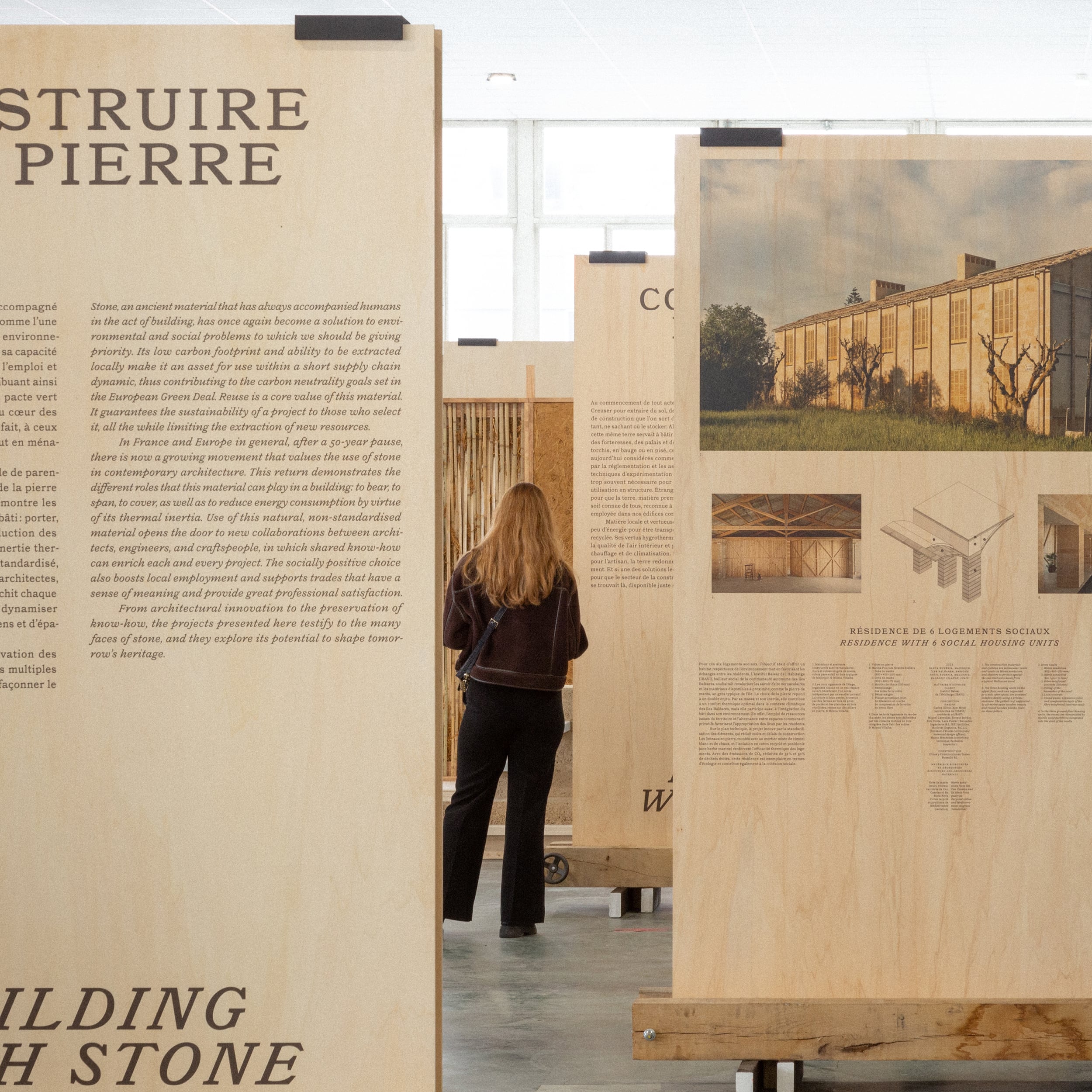 L’exposition et l’ouvrage Materia mettent en valeur les propriétés esthétiques, avantages constructifs et bénéfices environnementaux de 40 écoconstructions, sélectionnées dans le cadre du prix materia award. Le vaste plateau est jalonné d’une forêt de panneaux, dans laquelle les visiteurs circulent. Des clairières s’organisent autour des maquettes de principes constructifs. Les artisans sont mis à l’honneur par des photos grands formats, apportant une dimension humaine à ces aventures constructives. En écho au titre de l’exposition, le veinage apparent du bois donne une qualité plastique aux images, et permet d’harmoniser les singularités.