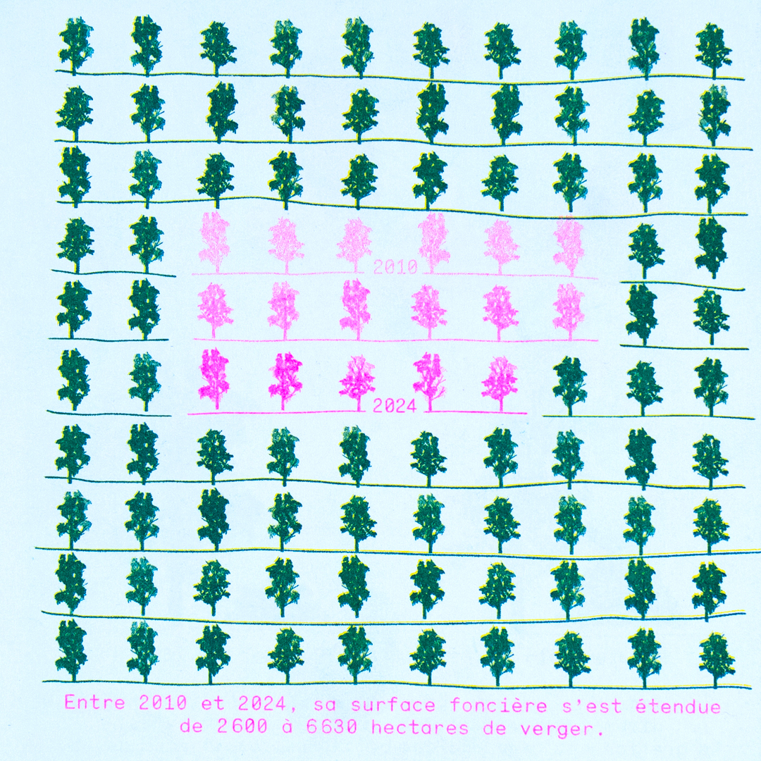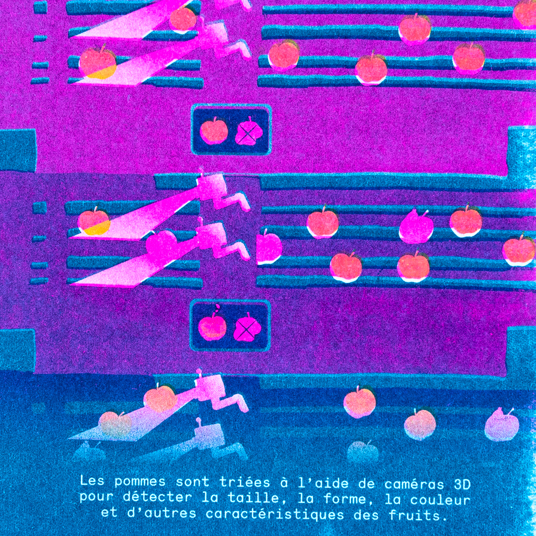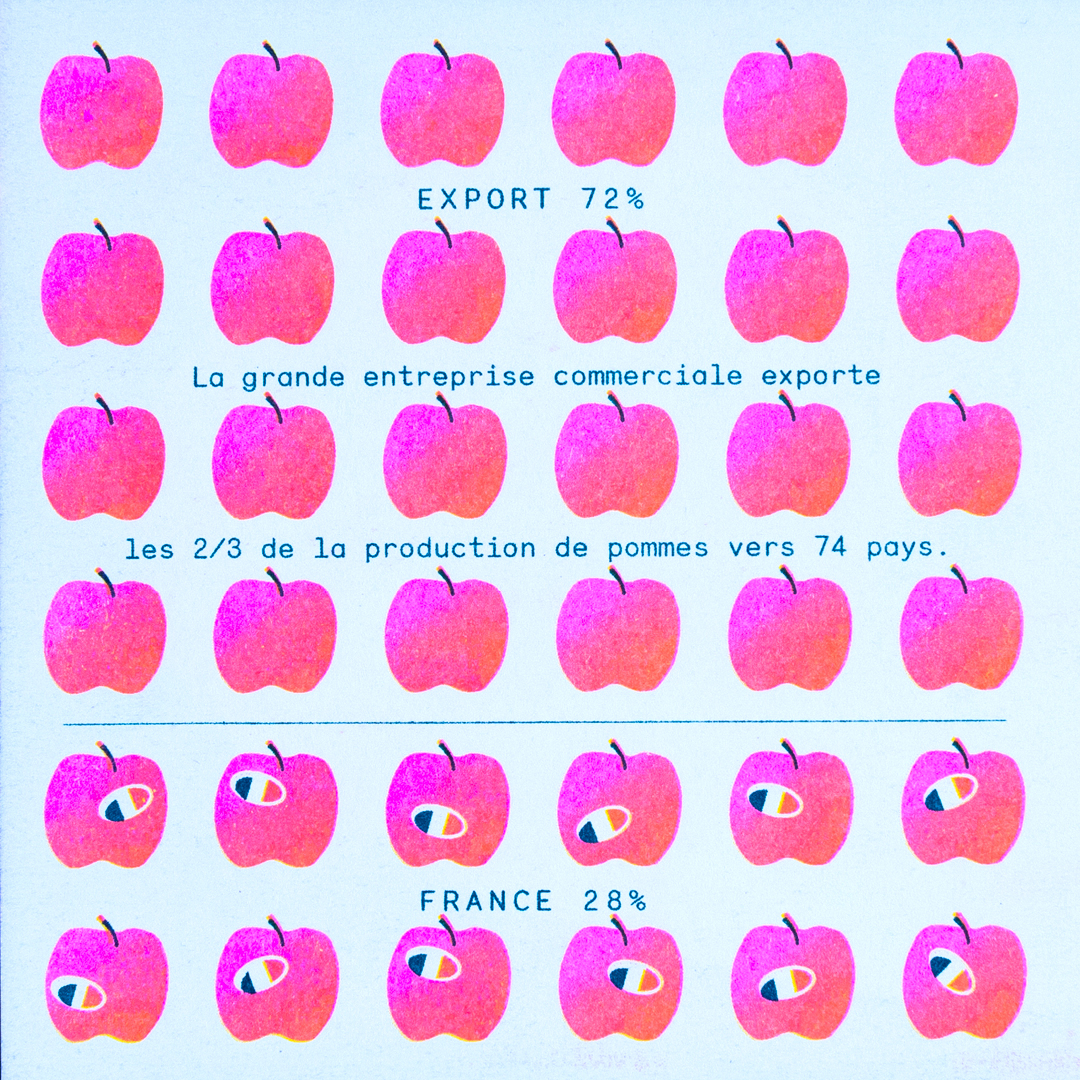 Il restitue une plongée dans les étendues de vergers agro-industriels du Tarn-et-garonne, et dans la production d’un aliment industriel calibré, sondé, scruté sous toutes ses coutures… avant de se retrouver sur les étals de marchés estampillé “pomme locale”. À la manière d’un film, le livre se découpe en séquences narratives variées, les modes de représentation se complètent pour offrir une compréhension à la fois globale et détaillée de cette chaîne d’approvisionnement (cartes, diagrammes, coupes, axonométries, narration).