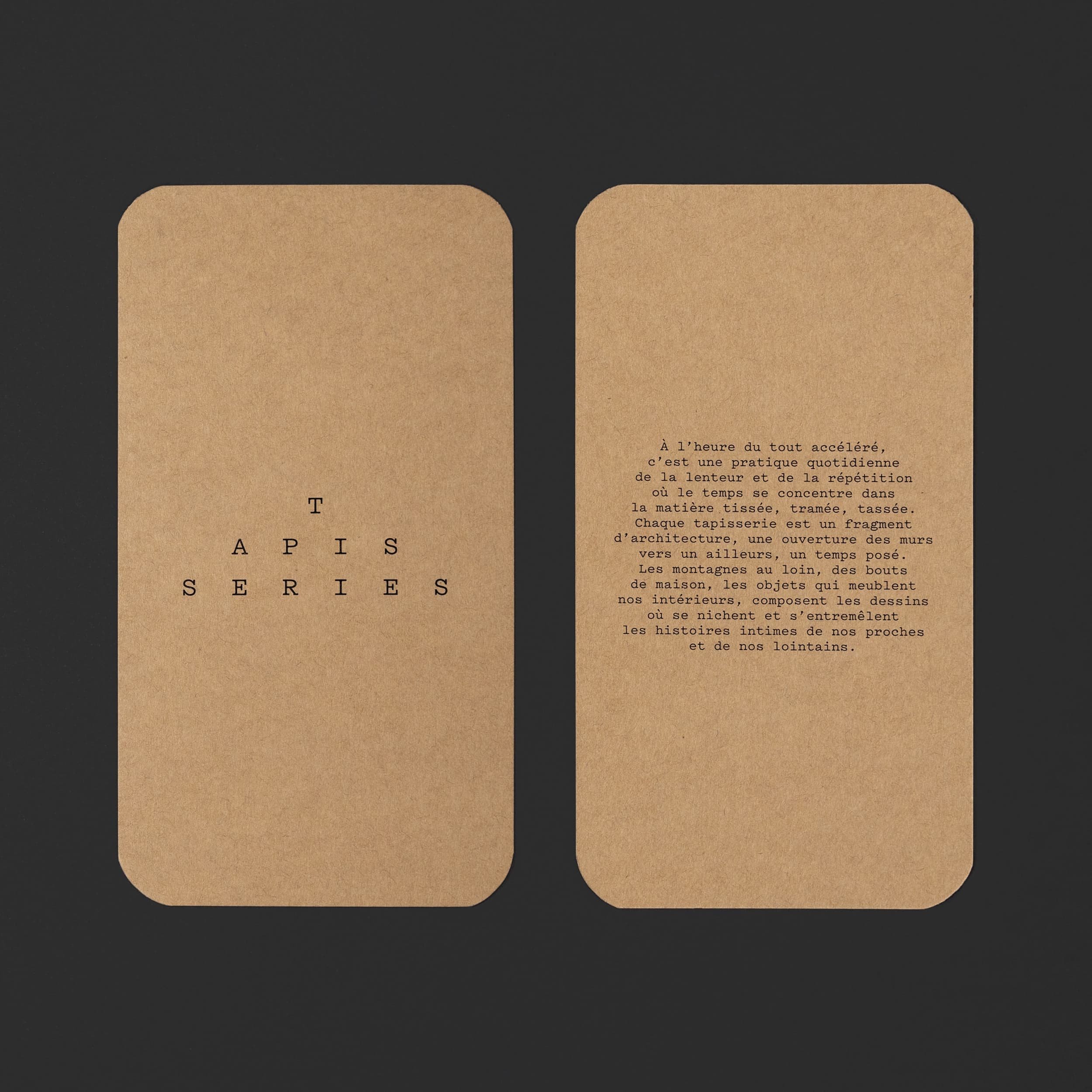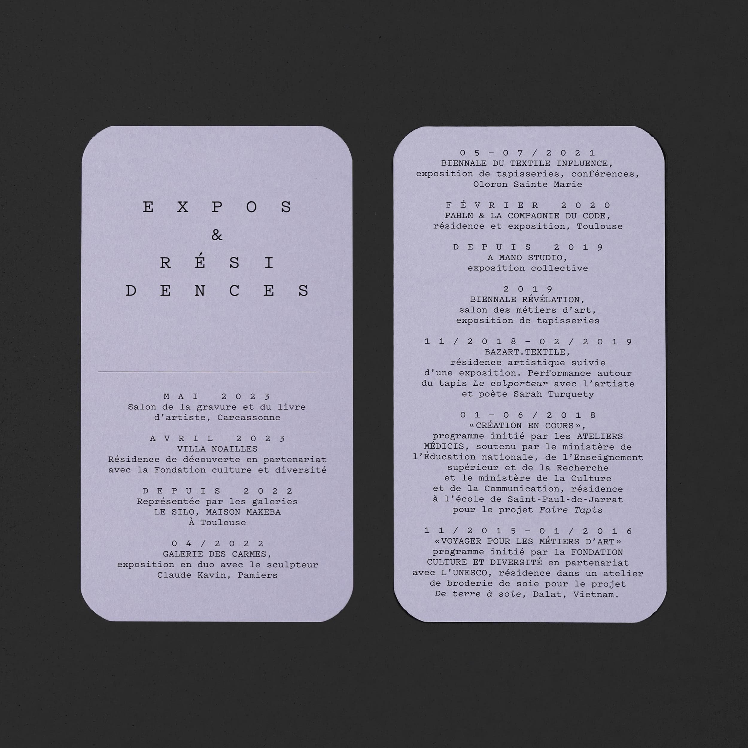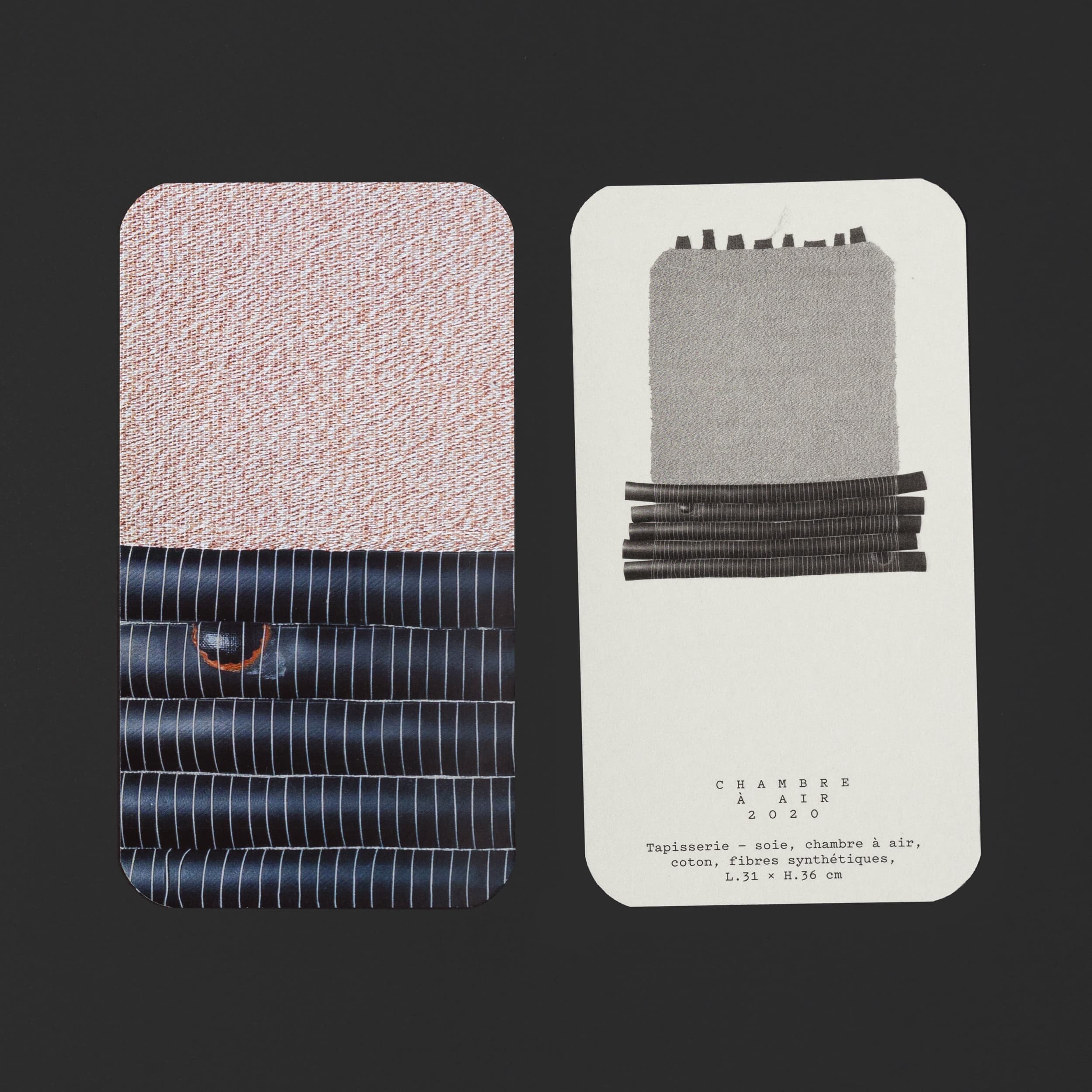 Les jeux de cartes ont une chose en commun avec les tapis: ils n’ont pas de sens de lecture. Le portfolio de Sarah Hô, artiste tisserande, présente ses pièces sous forme de cartes à jouer ♠♥♦♣ Ce format — qui tient à la fois dans la main, et se déploie aussi bien dans l'espace — permet une grande maniabilité en fonction des contextes. Chaque carte présente un détail en couleur au recto, et une vue d’ensemble en noir et blanc au verso. Les images sont mises en scène pour une lecture non-linéaire, souhaitée par Sarah: les projets sont à mélanger, rassembler, trier, tirer au hasard ou faire passer de main en main...