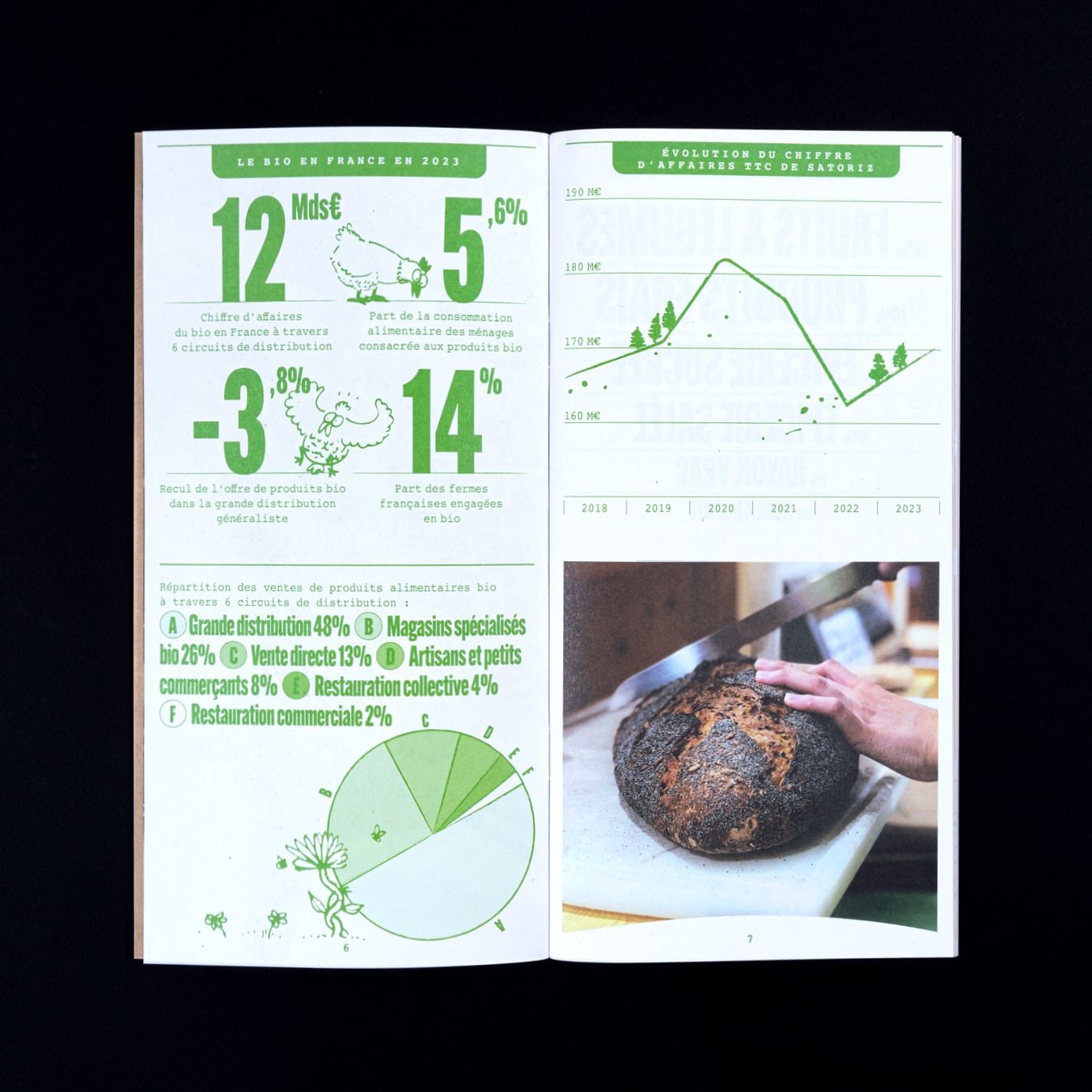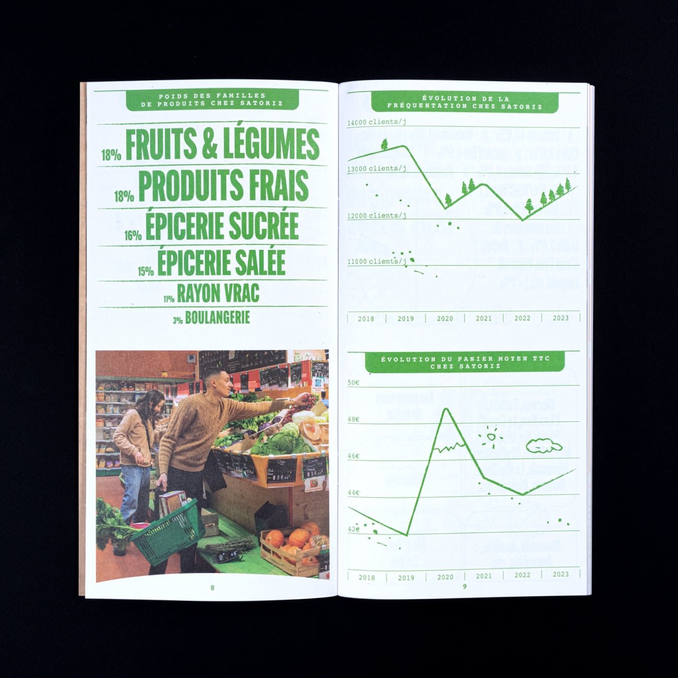 Rapport d’activité destiné à la clientèle des magasins bio Satoriz. Son format carré et ses contenus calibrés ont été conçus pour être relayés rapidement sur les réseaux sociaux.